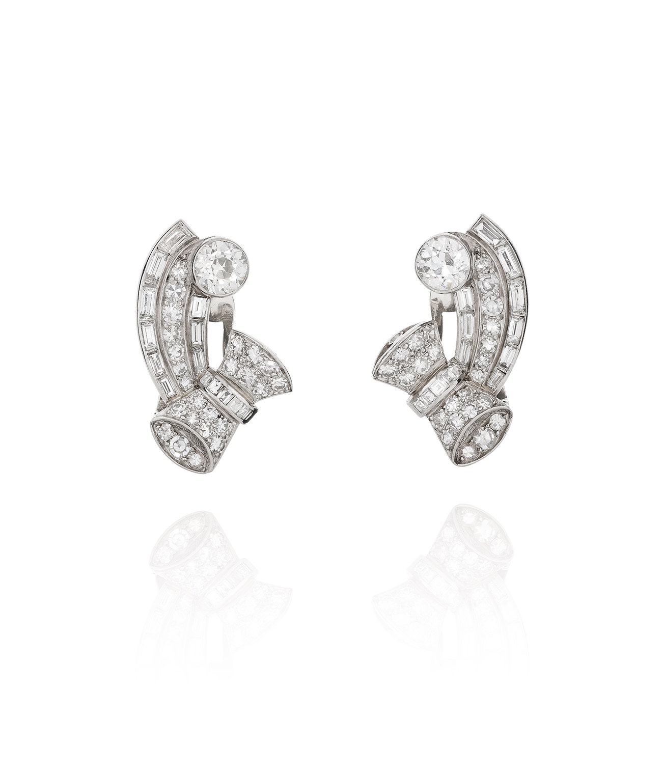 Each of ribbon design, set with a circular-cut diamond, accented with graduated circular-cut and baguette diamonds, length approximately 25mm.