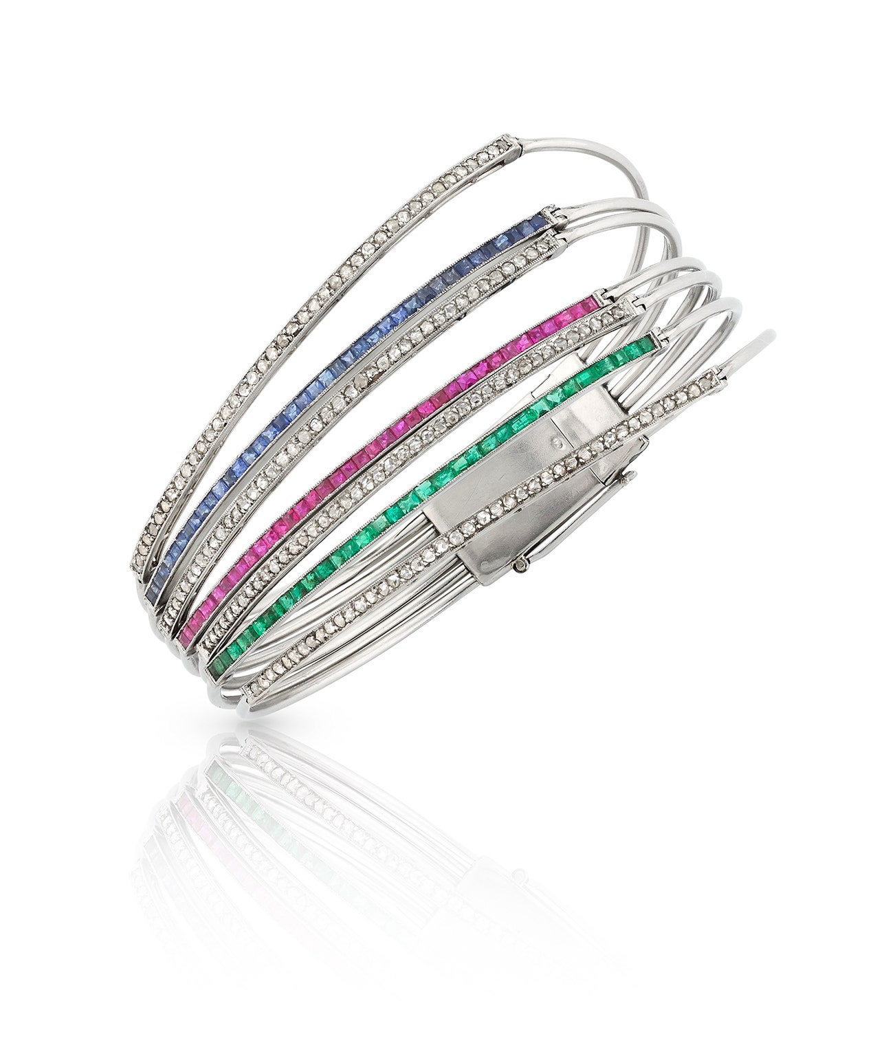 Set with calibré-cut rubies, sapphires and emeralds and circular-cut diamonds, inner circumference approximately 170mm.