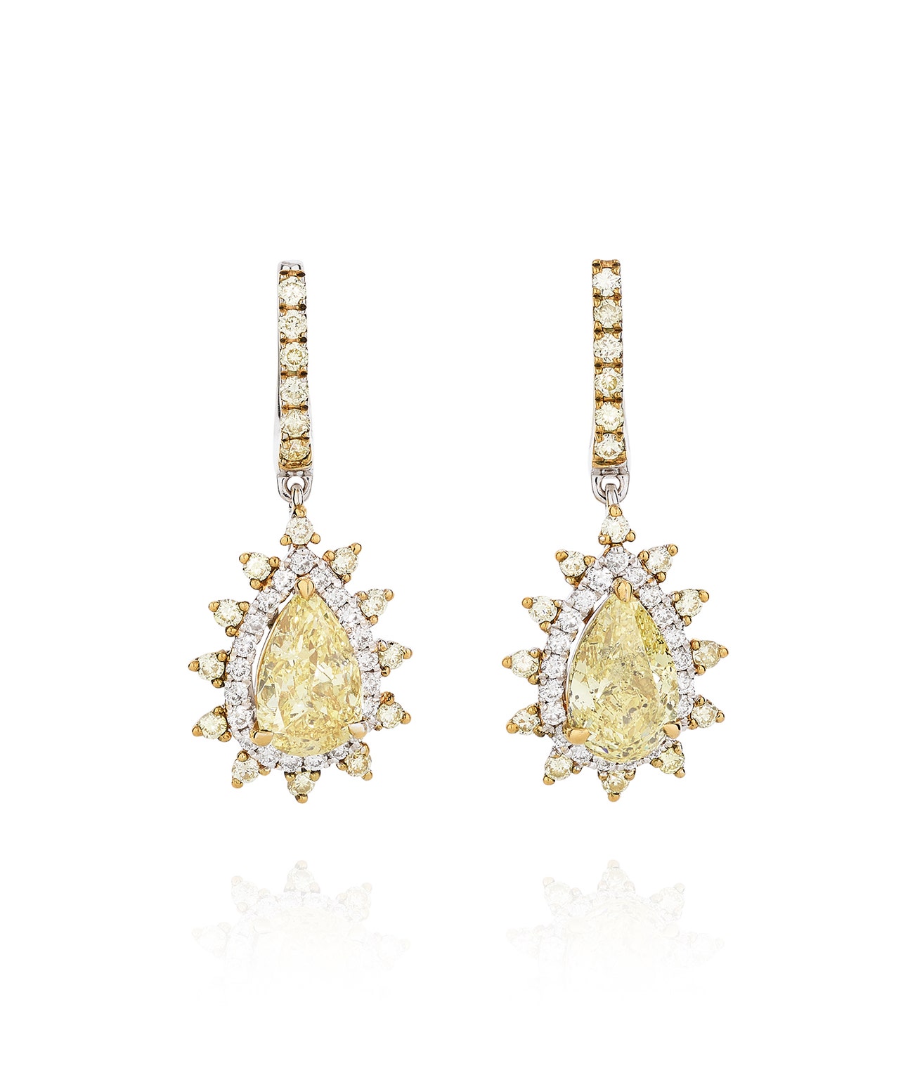 Each set with a pear-shaped fancy yellow diamond weighing 1.28 carats and 0.99 carats, accented with brilliant-cut diamonds and similarly cut diamonds of yellow tint, length approximately 27mm.