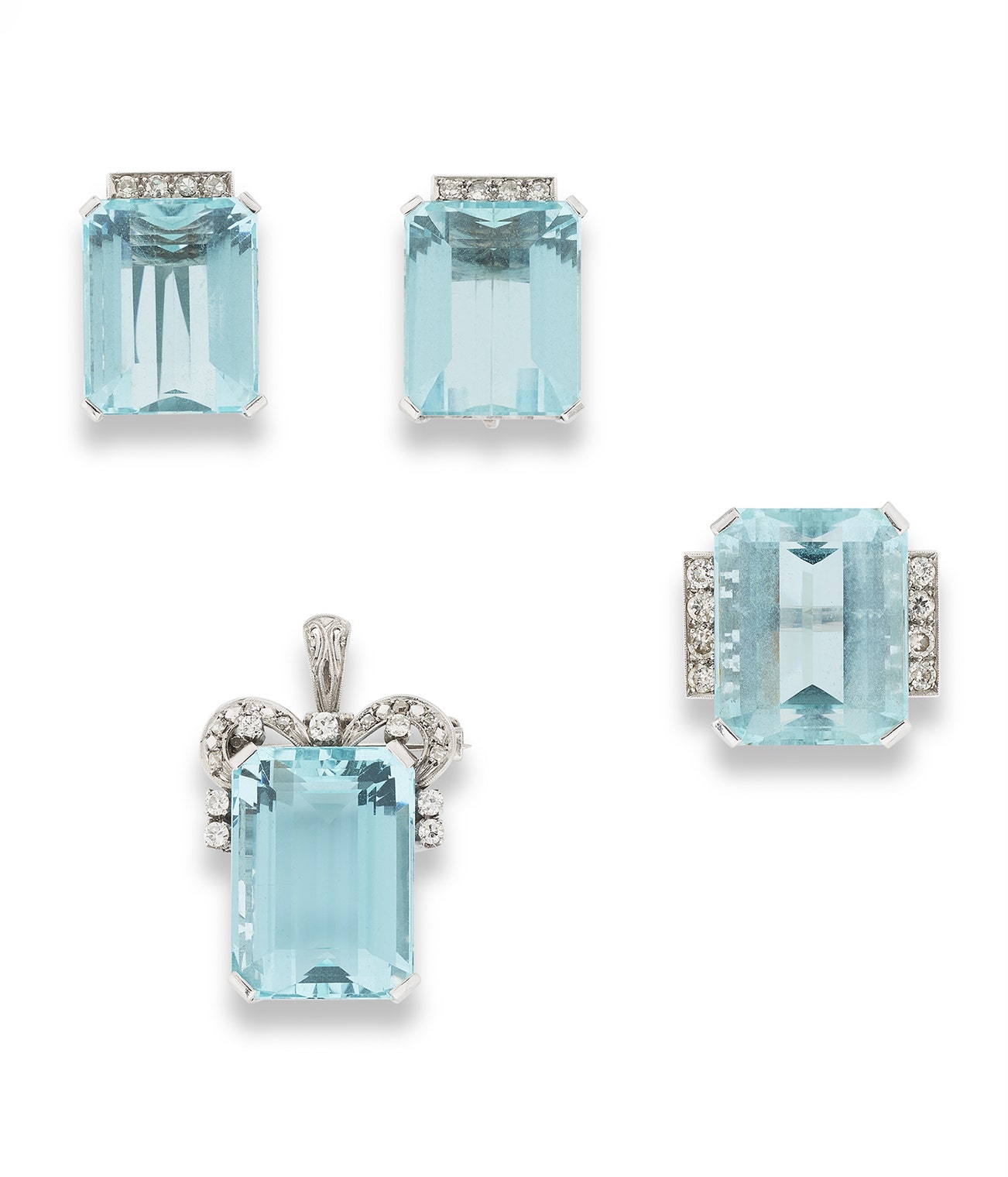 Comprising: a pendant set with step-cut aquamarine, accented with circular-cut diamonds, measuring approximately 32 x 22 x 13mm, may be worn as a brooch, together with a pair of ear clips, length approximately 20mm, and a ring, size 50.