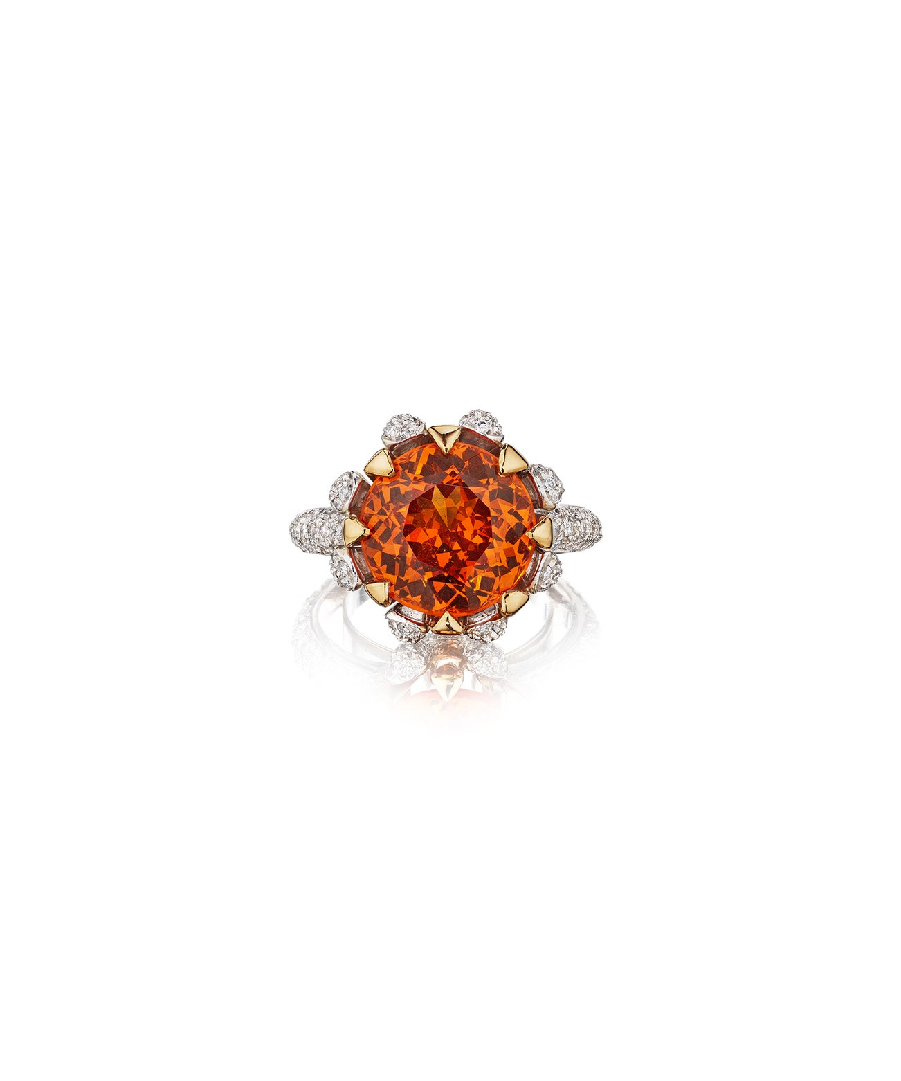Set with a round spessartine garnet, accent with brilliant-cut diamonds,