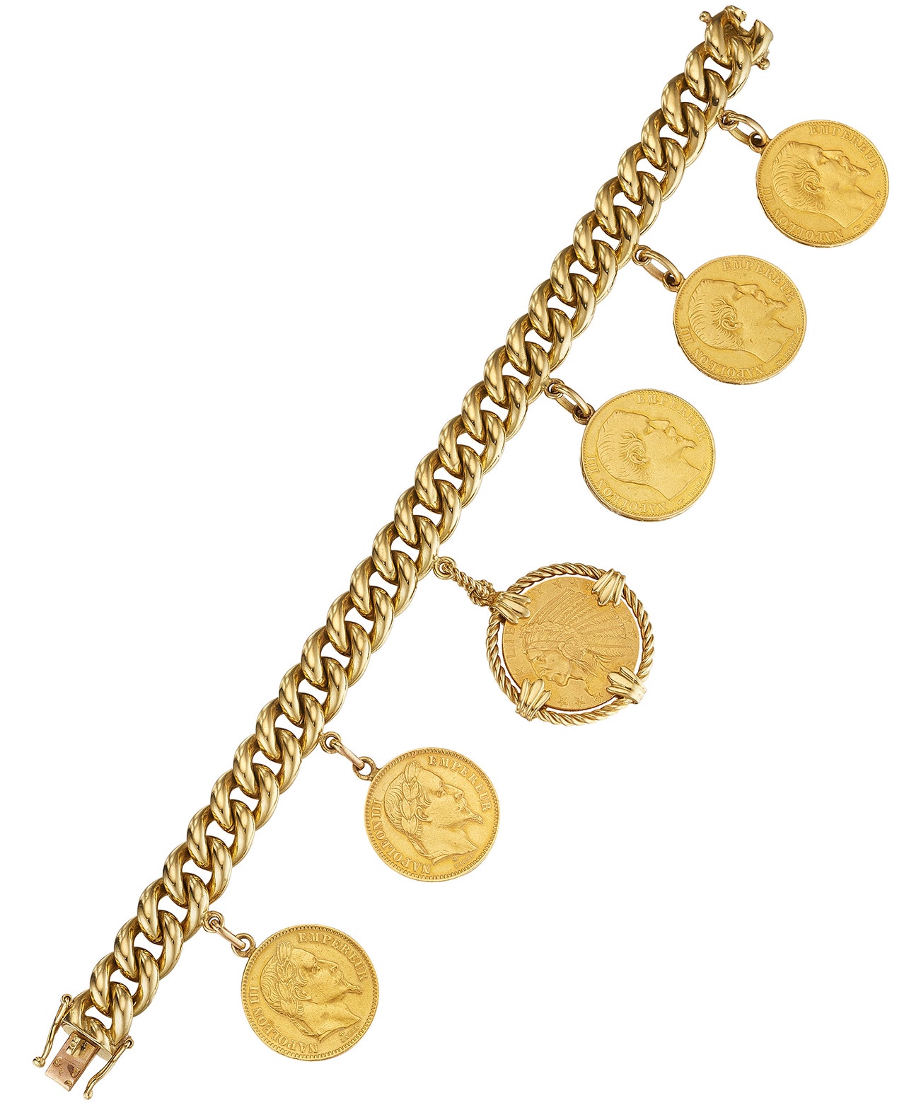 Composed of gold flat curb-links, supporting a fringe of 7 French coins, mounted in 18K yellow gold, length approximately 7 1/2 inches, with maker's mark and French assay mark.