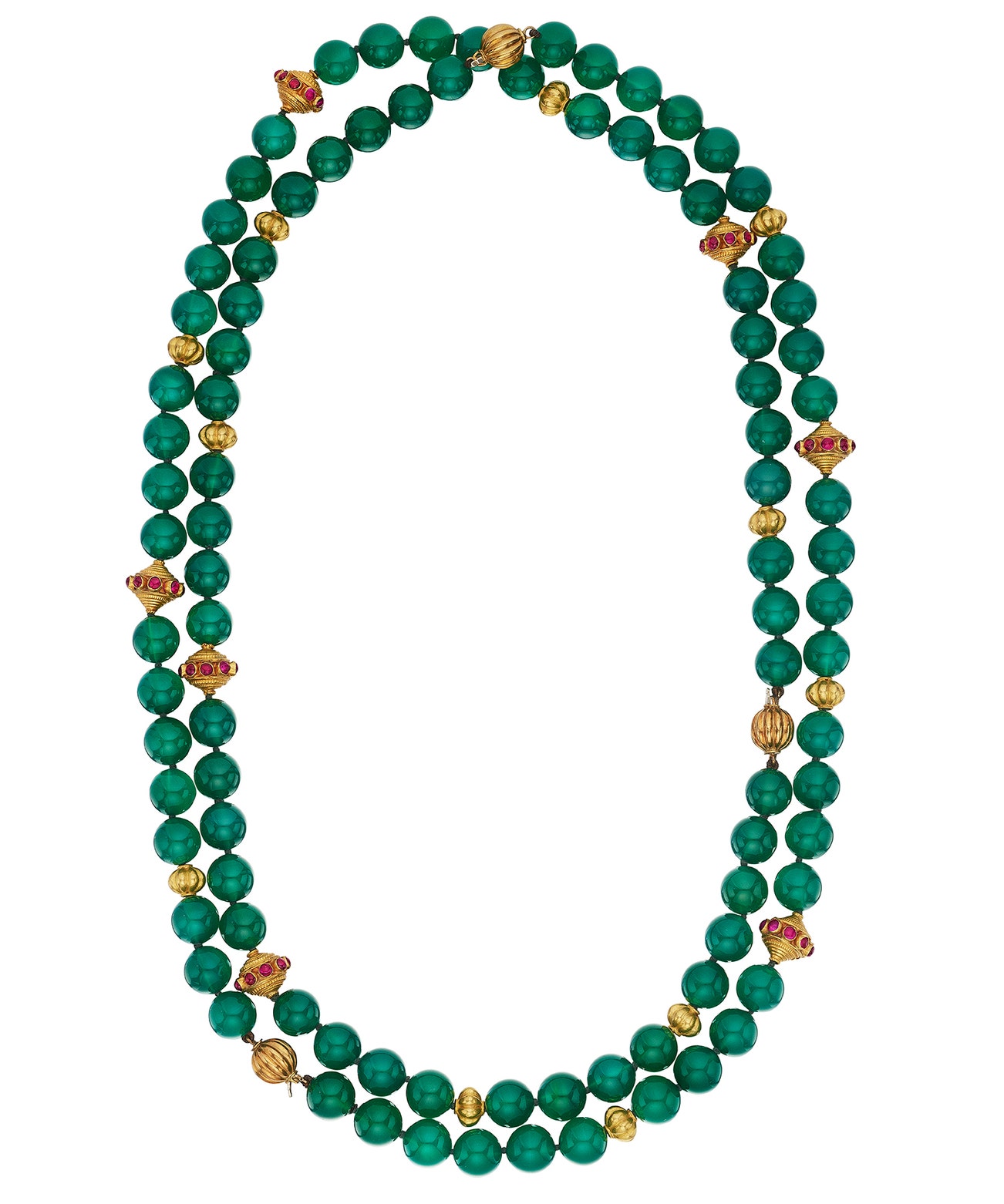 Comprising three strands, each set with chrysoprase beads, decorated with round ruby cabochons, mounted in 18K yellow gold, length measuring approximately 16 1/4 inches, 18 inches and 20 inches.