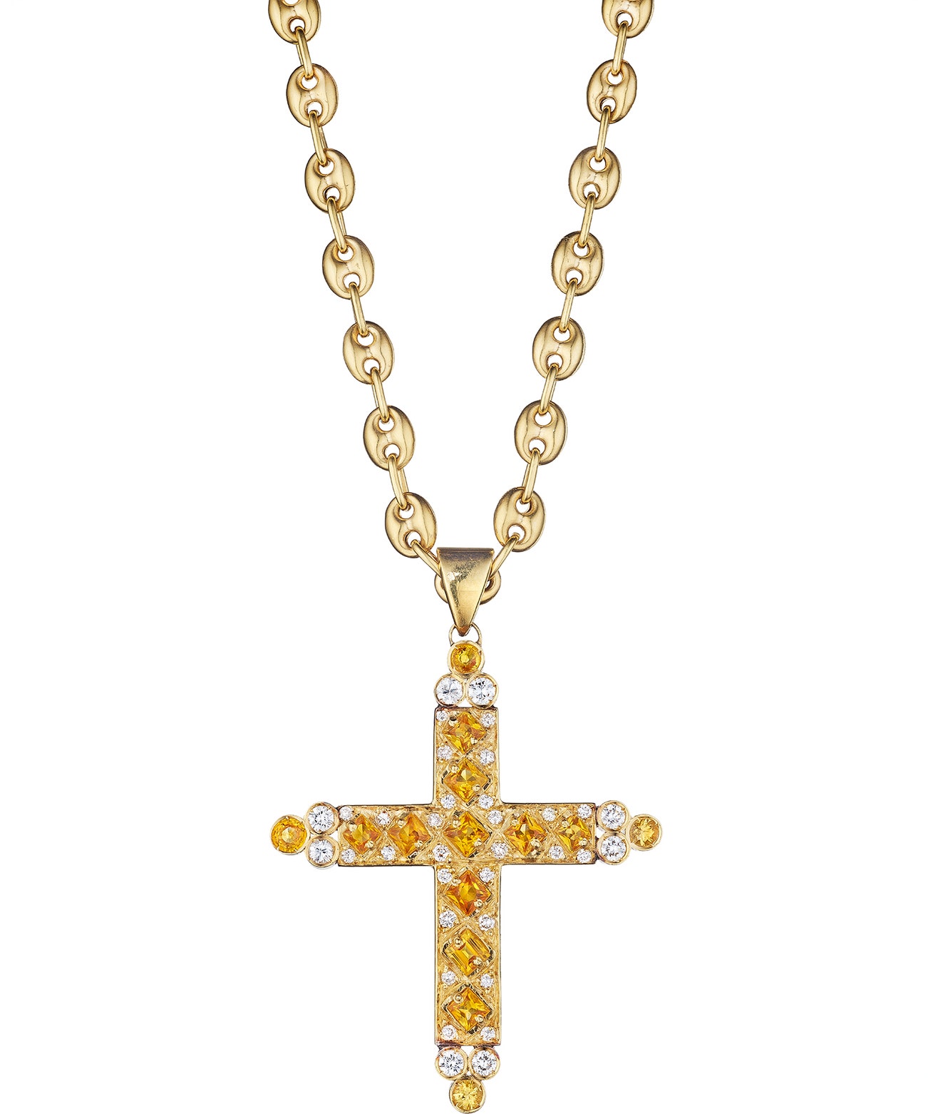 Set with square shape and round shape orange sapphires, decorated with brilliant-cut diamonds, mounted in 18K yellow gold, chain length measuring approximately 20 1/2 inches, pendant length approximately 2 inches, with maker's mark.