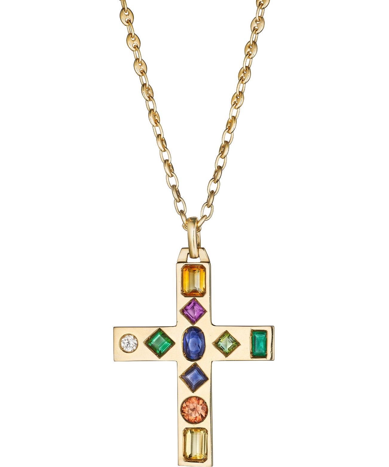 Set with multi-colored gemstones, accented with a round brilliant-cut diamond, mounted in 18K yellow gold, chain length measuring approximately 23 inches, pendant length measuring approximately 2 1/4 inches, signed Roman on the chain, with maker's mark.