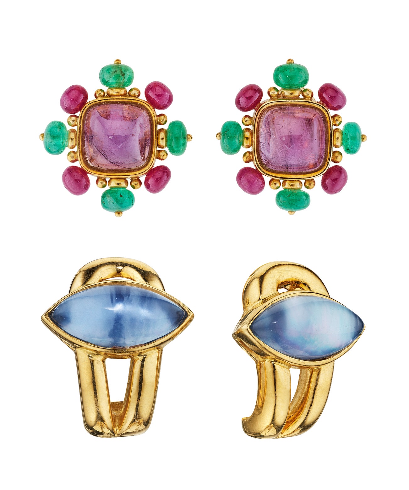 Comprising two pairs of earclips, one set with cushion shape amethyst cabochons, accented by ruby and emerald beads; one set with marquise shape iolite cabochons; mounted in 18K yellow gold, length measuring approximately 1 inch and 3/4 inch.