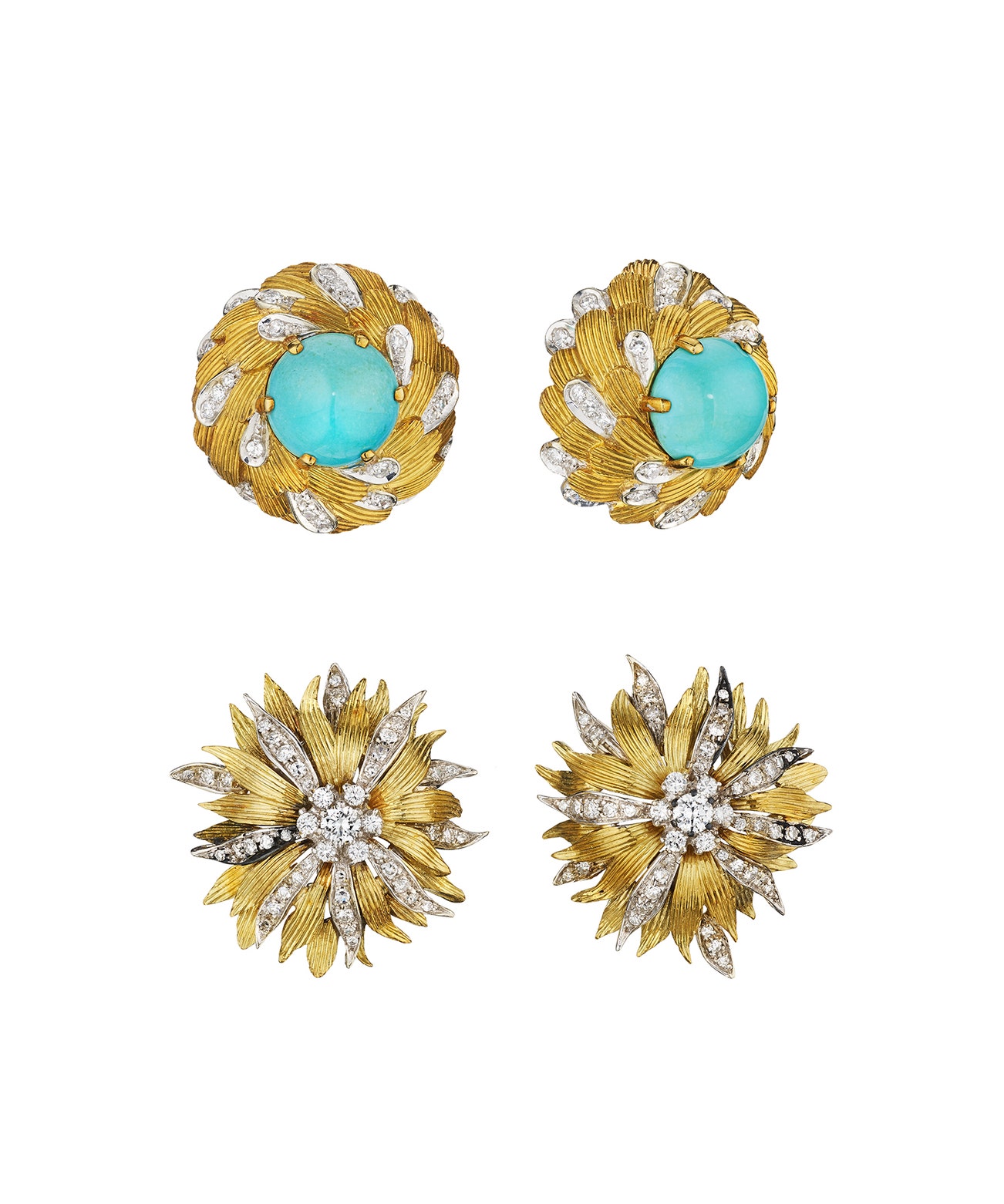 Comprising of two pairs of earclips, one set with turquoise cabochons with brilliant-cut diamond accents; one set with brilliant-cut diamonds; mounted in 18K gold, length measuring approximately 1 inch and 7/8 inch, with Italian assay mark.