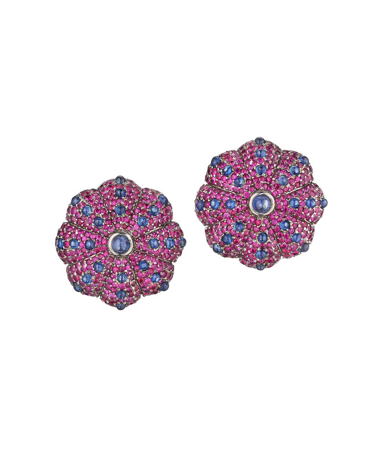 Set with round rubies and sapphire cabochons, mounted in rhodium plated 18K gold, length measuring approximately 1 inch.