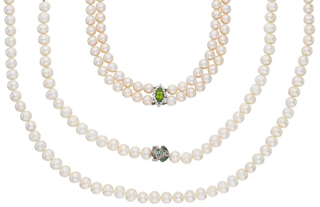 Comprising three strands of cultured pearl necklaces, each set with cultured pearls, one strand decorated with a marquise shape peridot and brillliant-cut diamonds; one strand decorated with round tsavorite garnets and brilliant-cut diamonds in a frog design; mounted in 18K white gold, length measuring approximately 19 inches, 19 3/4 inches and 34 1/4 inches, one strand signed Valente Milano.