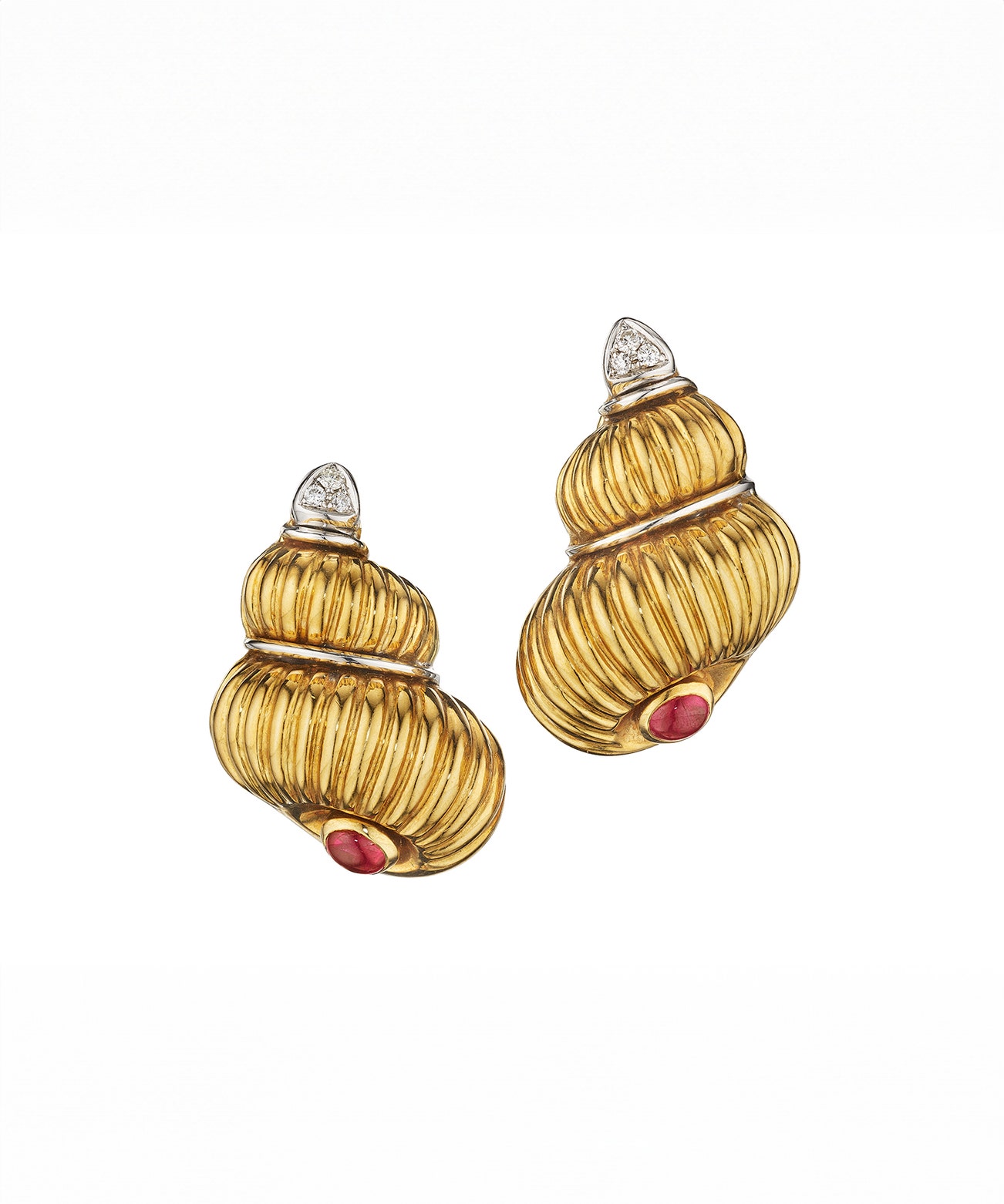 Designed as a pair of shells, each set with an oval ruby cabochon, accented by brilliant-cut diamonds, mounted in 18K yellow gold and white gold, with assay mark.