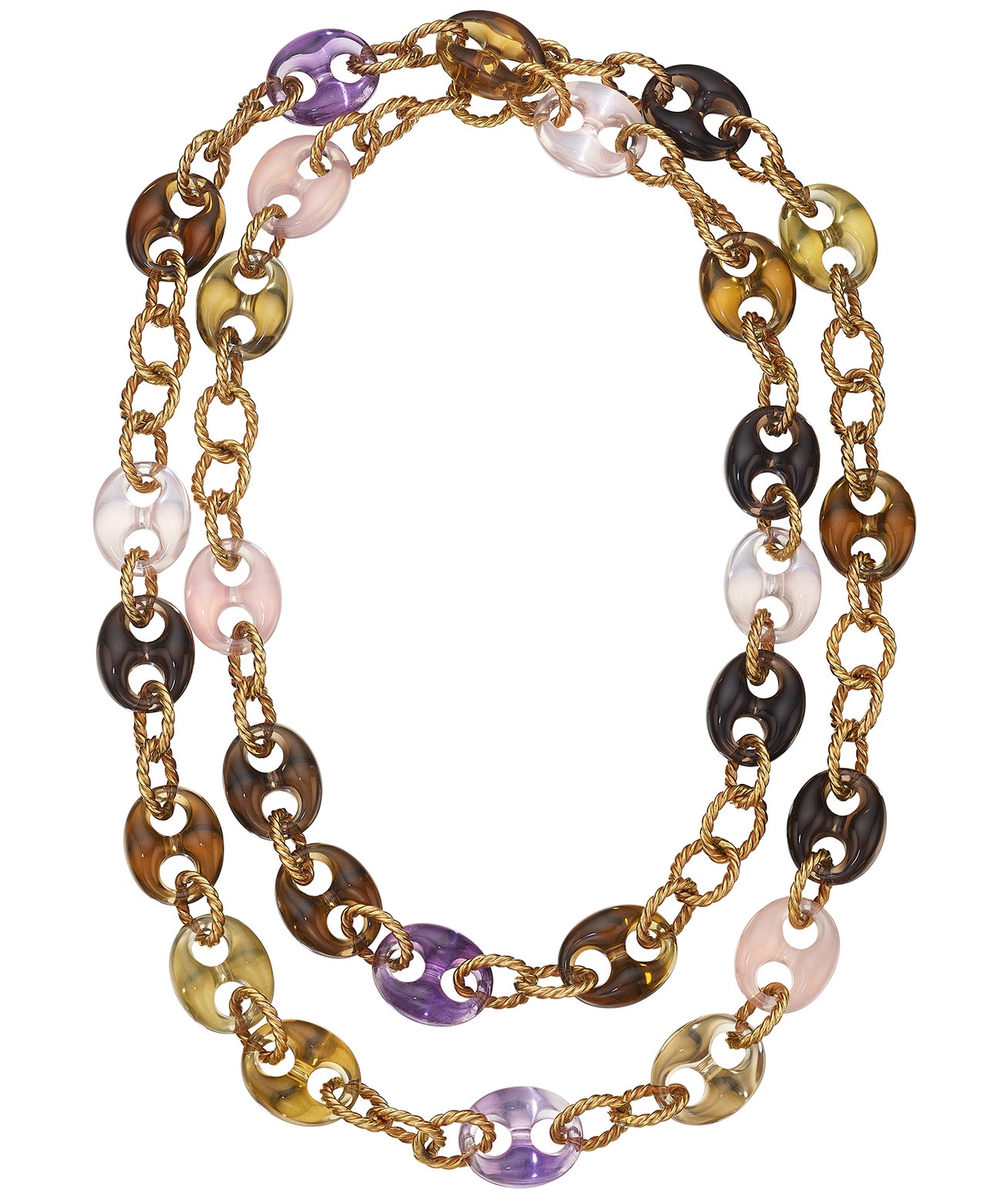 Set with carved amethyst, rose quartz and smoky quartz, mounted in 18K yellow gold, length measuring approximately 43 inches, signed Nicolis Cola, with maker's mark.