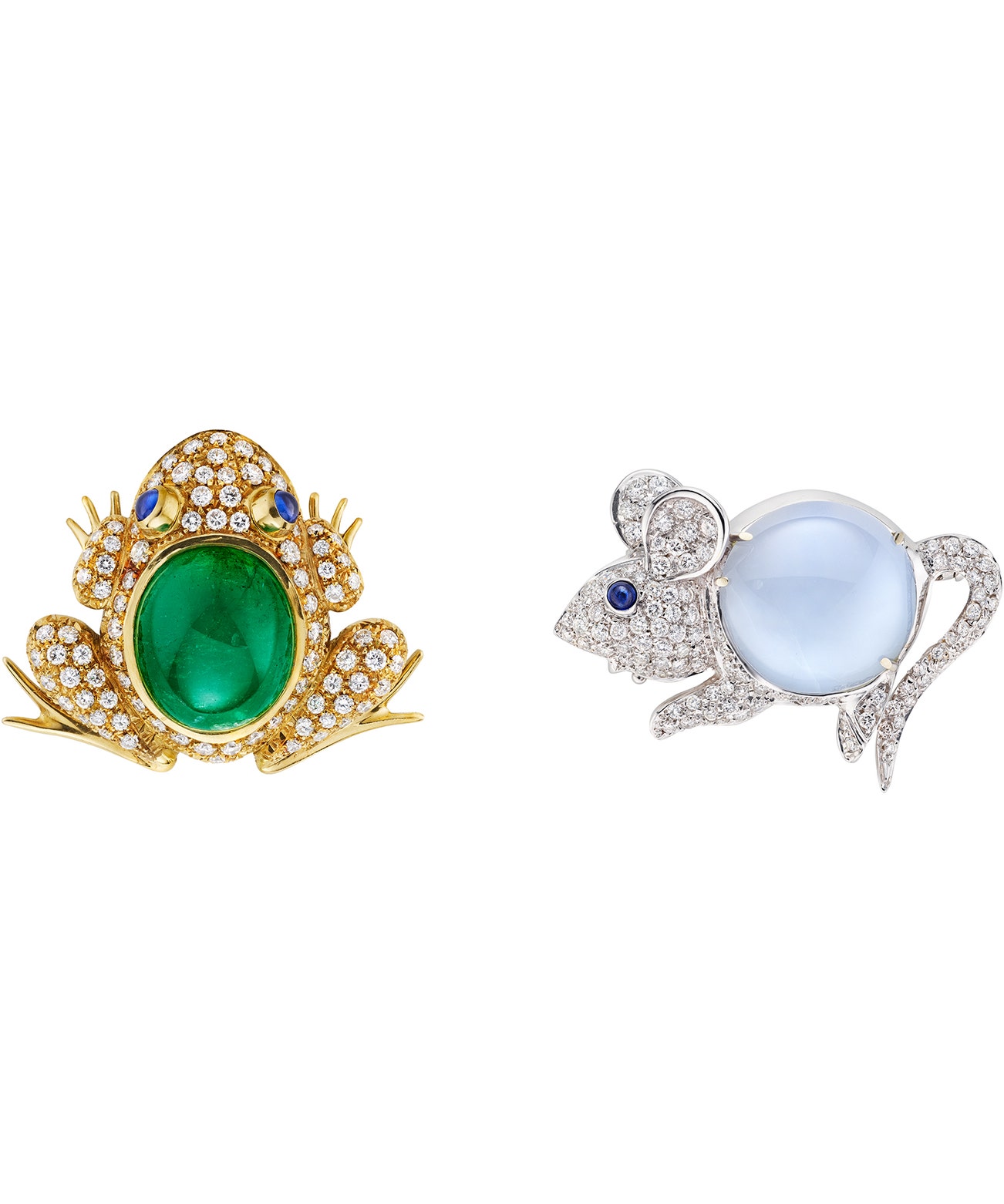 Comprising of two brooches, one set with a chalcedony cabochon, accented with a sapphire cabochon; one set with an emerald cabochon, accented with sapphire cabochons; both decorated with brilliant-cut diamonds, mounted in 18K gold, length measuring approximately 1 1/8 inches and 1 1/2 inches, signed Missiaglia and Andreoli, with Italian assay mark.