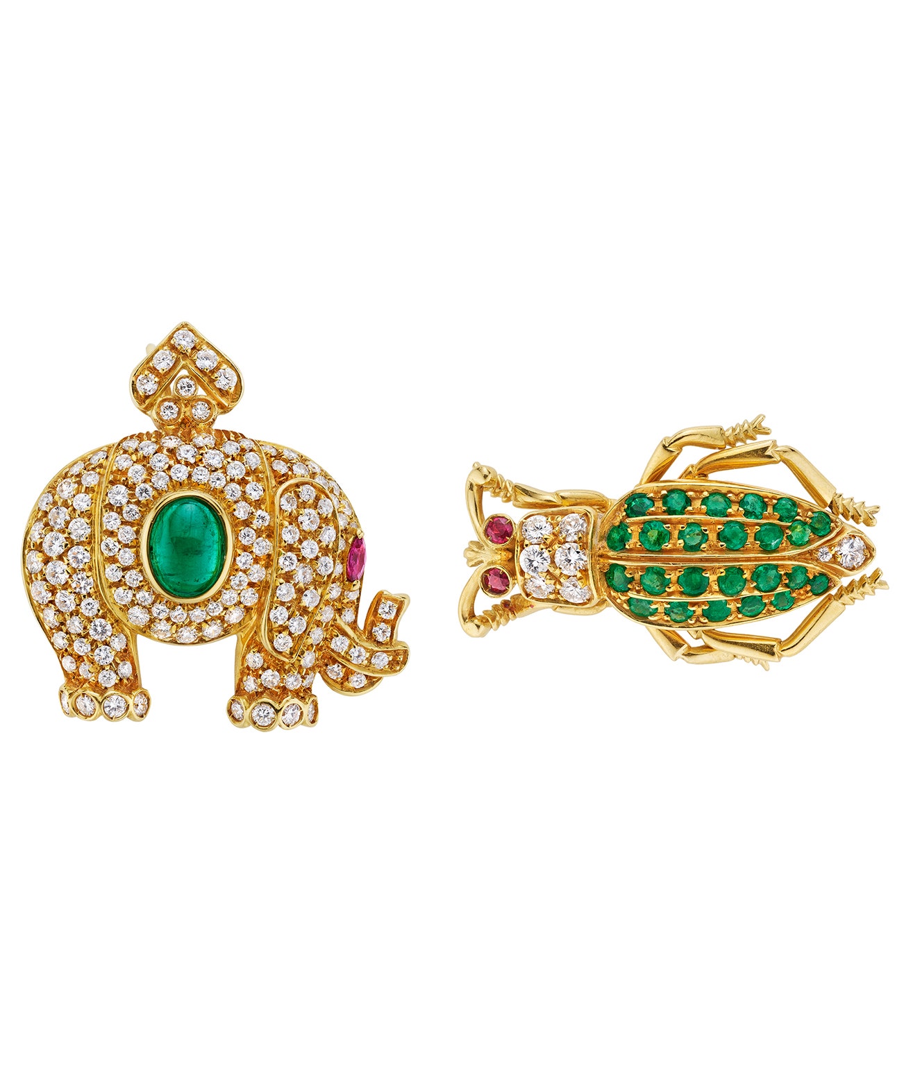 Comprising of two brooches, one set with an emerald cabochon and a marquise shape ruby; one set with round emeralds and round rubies; both decorated with brilliant-cut diamonds, mounted in 18K yellow gold, length measuring approximately 1 3/8 inches and 1 1/4 inches, with Italian assay mark.