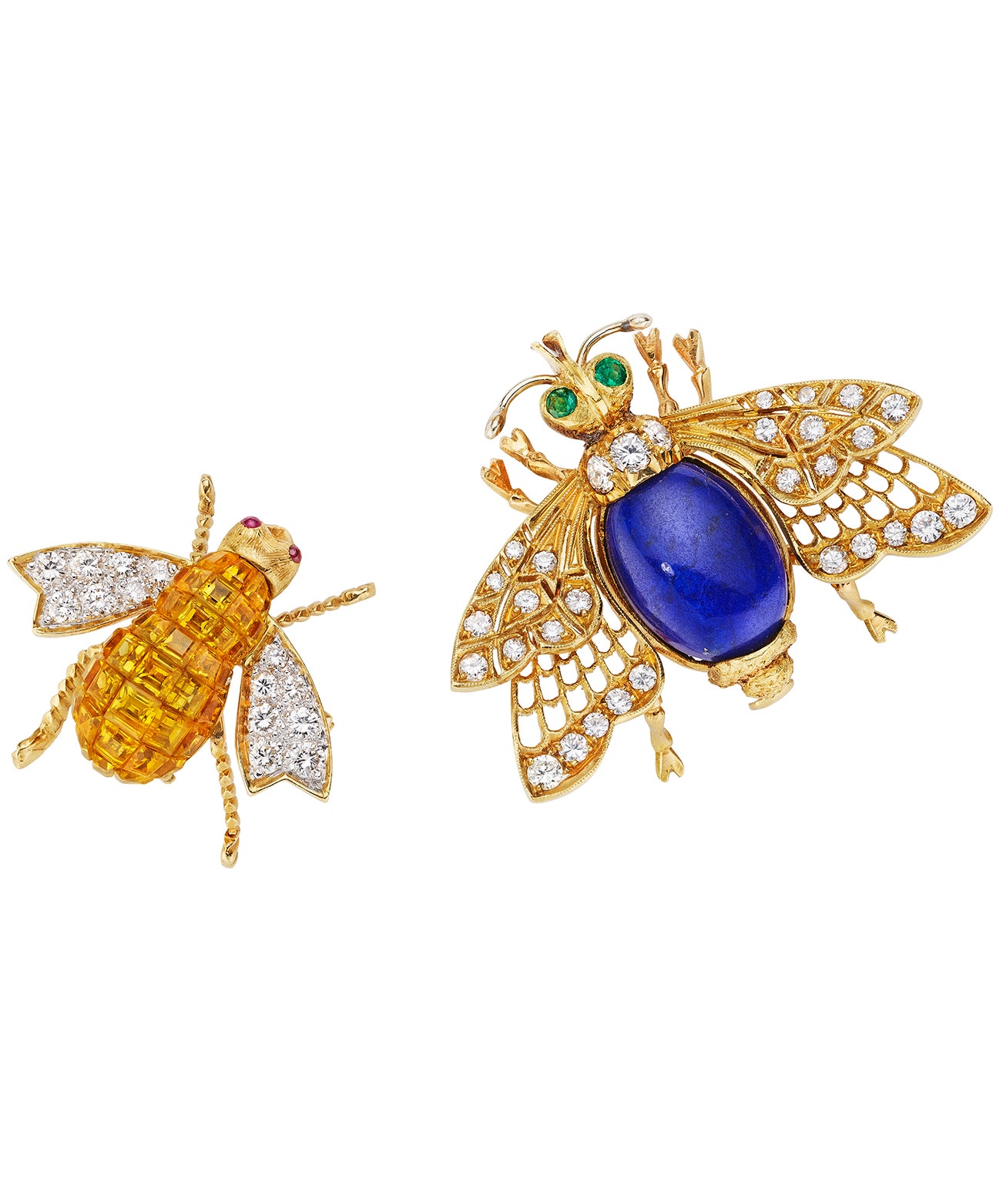 Comprising two brooches, one set with calibré cut citrines and brilliant-cut diamonds, accented with ruby cabochons; one set with lapis lazuli cabochon and brilliant-cut diamonds, accented by round emeralds; mounted in 18K gold, length measuring approximately 1 inch and 3/4 inch, with marker's mark.