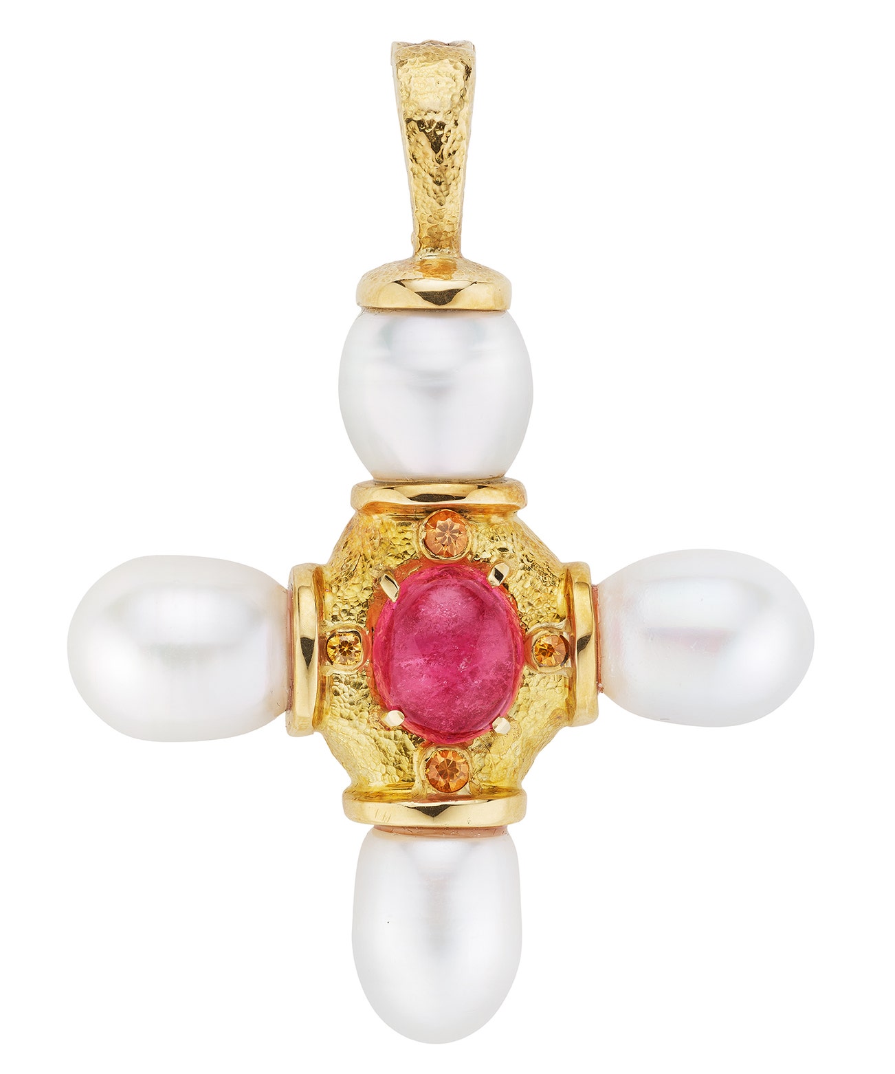 Set with an oval shape pink tourmaline cabochon and cultured pearls, decorated with round orange sapphires, mounted in 14K yellow gold, length measuring approximately 2 1/2 inches.