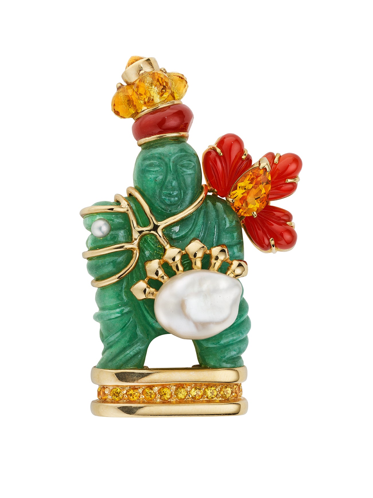 Set with carved aventurine quartz and red chalcedony, accented by faceted citrine beads, pear- and round shape citrines with cultured pearls, mounted in 18K gold, length measuring approximately 2 1/4 inches.