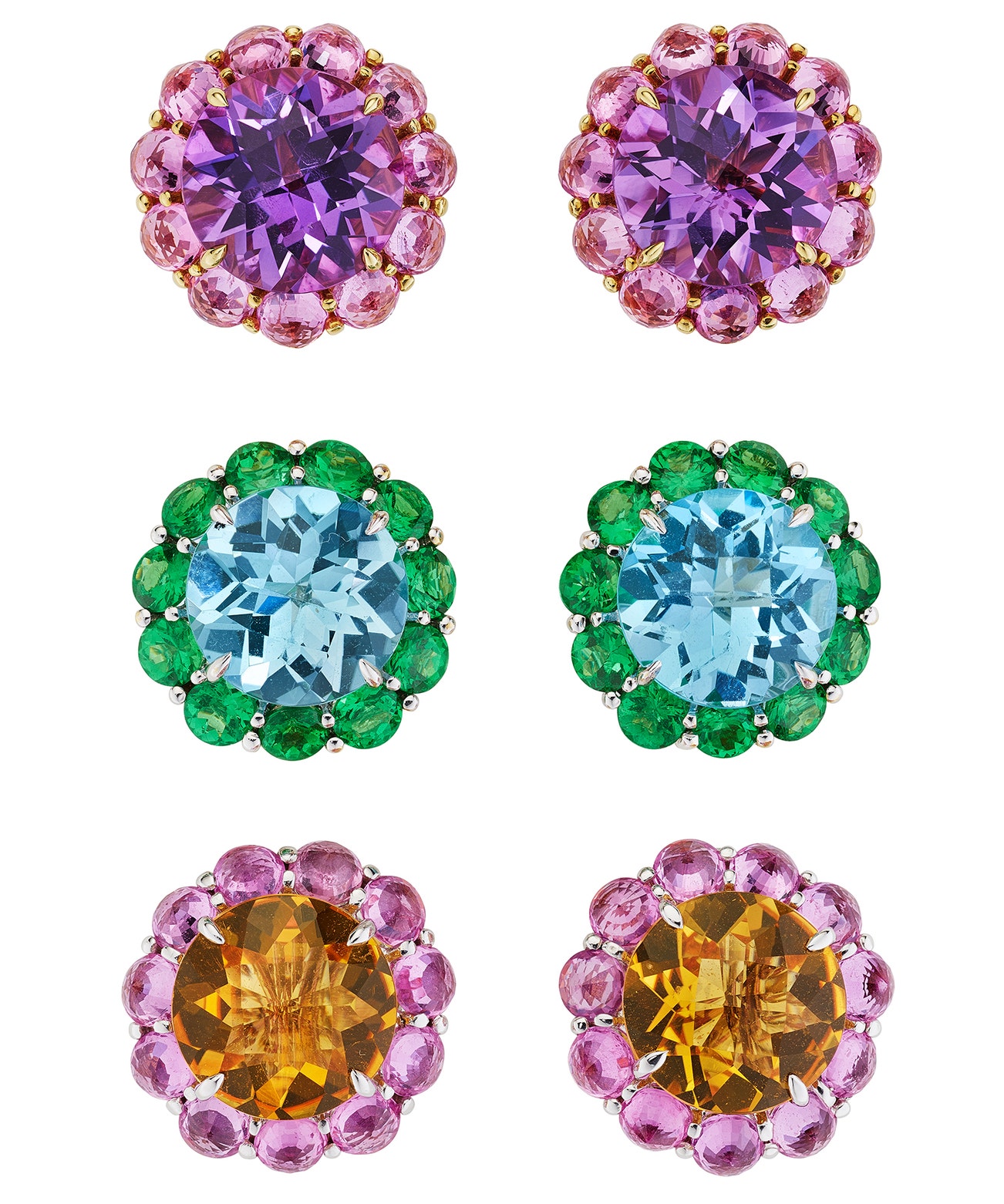 Comprising three pairs of earclips, one set with round faceted citrines and accented with round pink sapphires; one set with round faceted amethyst and accented with pink sapphires; one set with round faceted topaz and accented with round tsavorite garnets, mounted in 18K gold, length measuring approximately 5/8 inch, 3/4 inch and 5/8 inch, with Italian assay mark. One pair signed Paolo Costagli and one pair Nardi.