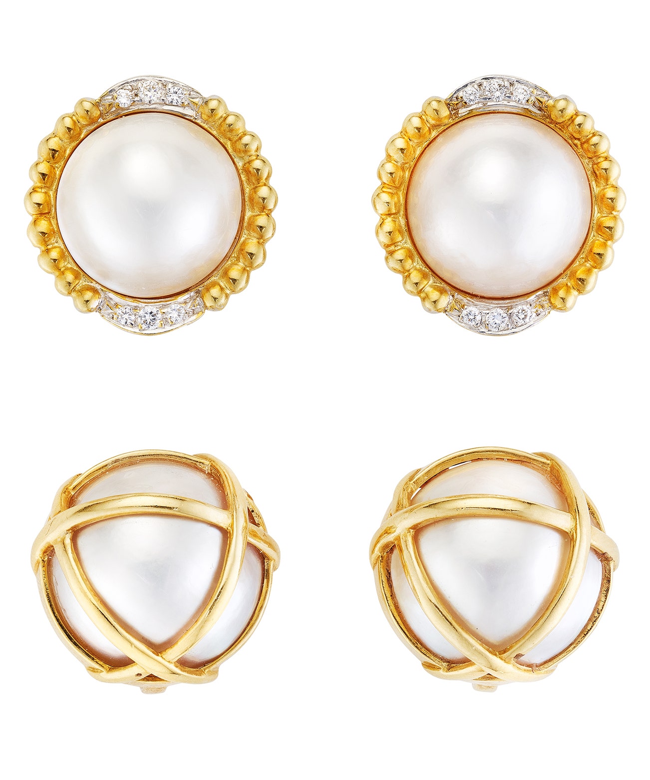 Comprising 2 pairs of earclips, each set with a Mabe pearl, one pair decorated by brilliant-cut diamonds, mounted in 18K yellow gold, length measuring approximately 1 inch.