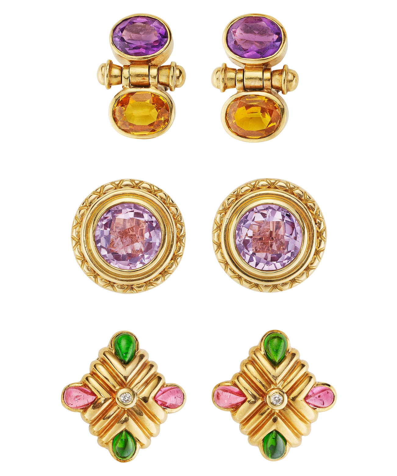 Comprising three pairs of earclips, set with multi-colored gemstones, accented by brilliant-cut diamonds, mounted in 18K yellow gold, with maker's mark.
