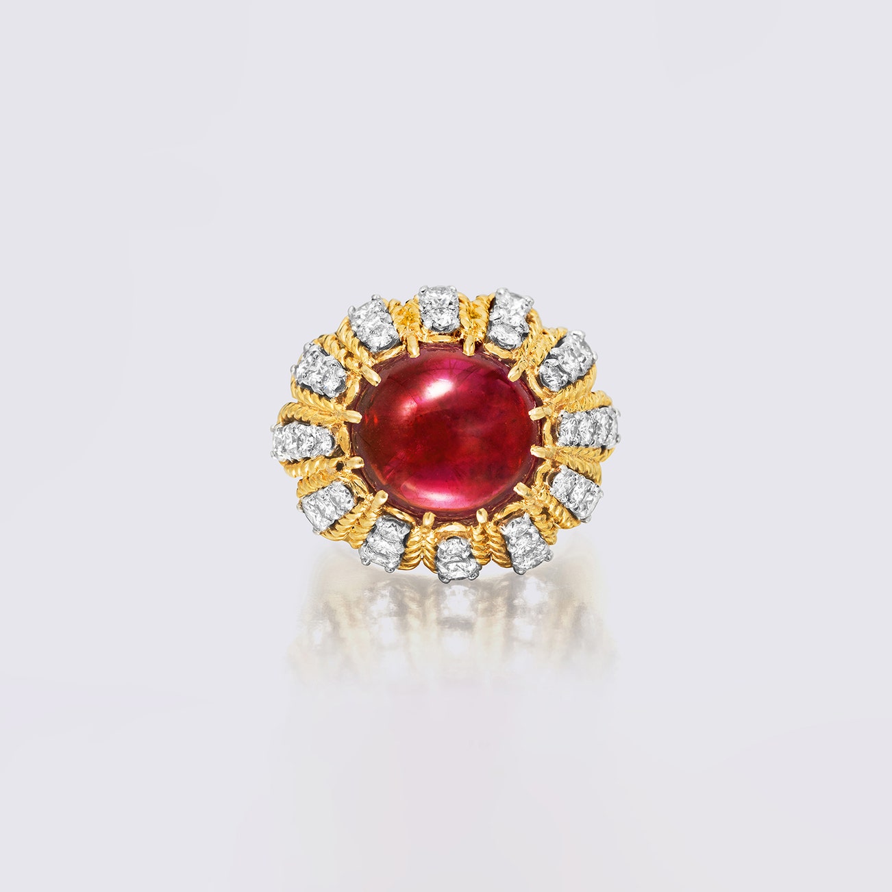 Set with an oval-shaped ruby cabochon weighing approximately 8.75 carats, accented by brilliant-cut diamonds, mounted in 18K gold, size 5 1/4.