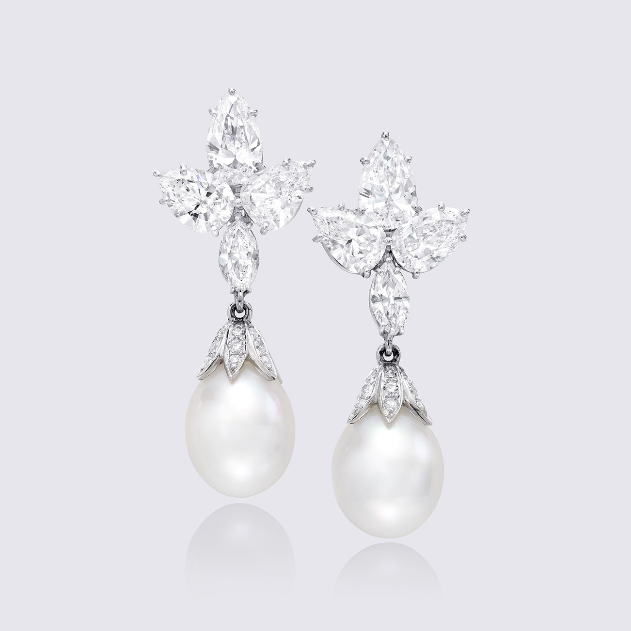 Set with cultured pearl drops, accented by pear-, marquise-shaped and single-cut diamonds, mounted in 18K white gold, length approximately 1 1/2 inches, fitted with posts, cultured pearl drops can be detached.