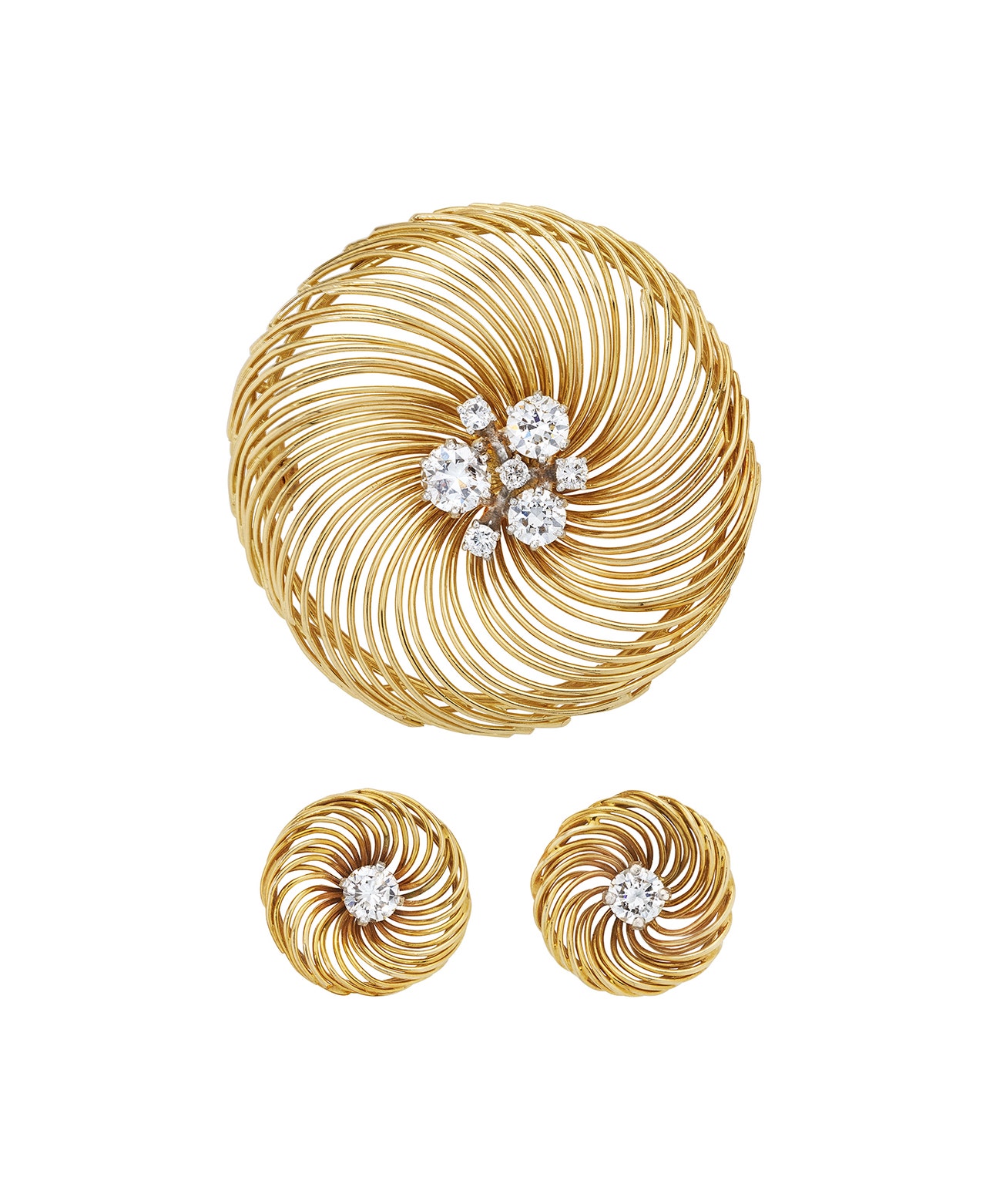 Comprising one brooch and a pair of matching earclips, set with brilliant-cut diamonds, mounted in 18K and 9K gold, brooch measures approximately 1 3/4 inches in diameter and earclips measures approximately 5/8 inch in diameter.