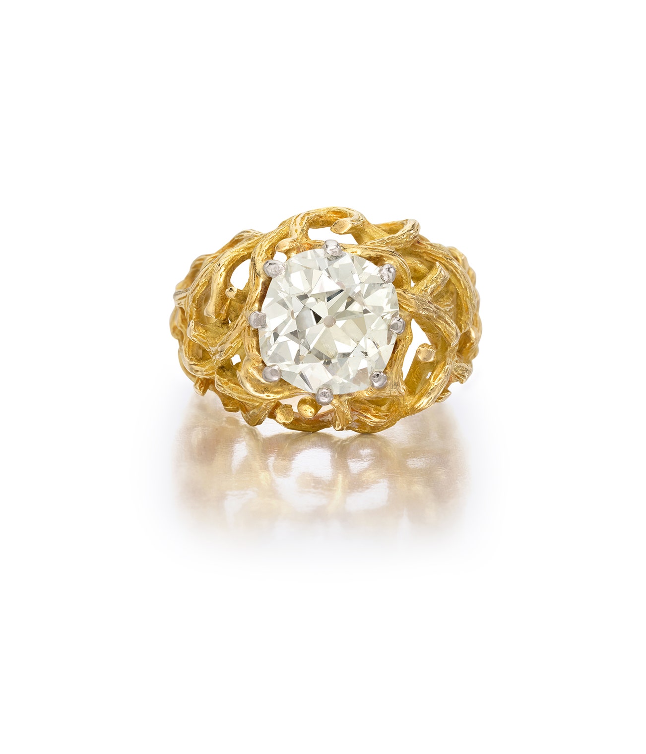 Designed as interlacing branches, set with a cushion-shaped diamond weighing 2.67 carats,