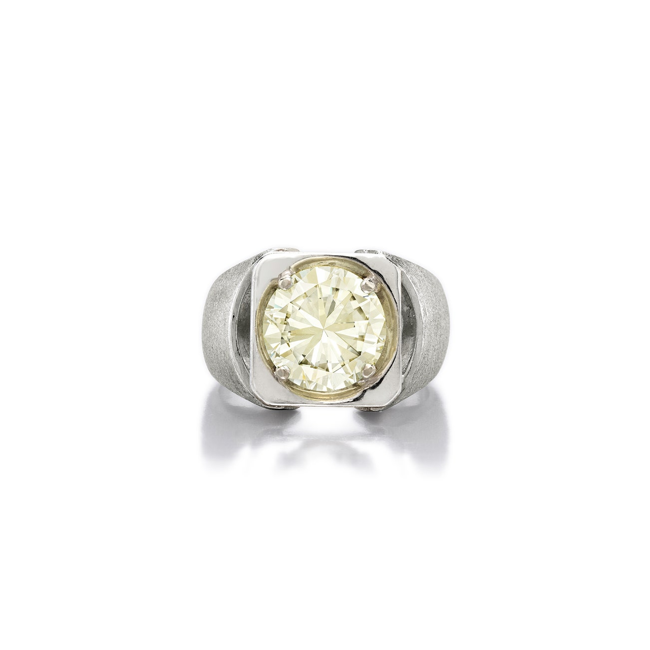Set with a round brilliant-cut diamond weighing approximately 4.60 carats, mounted in 14K white gold, size 9.