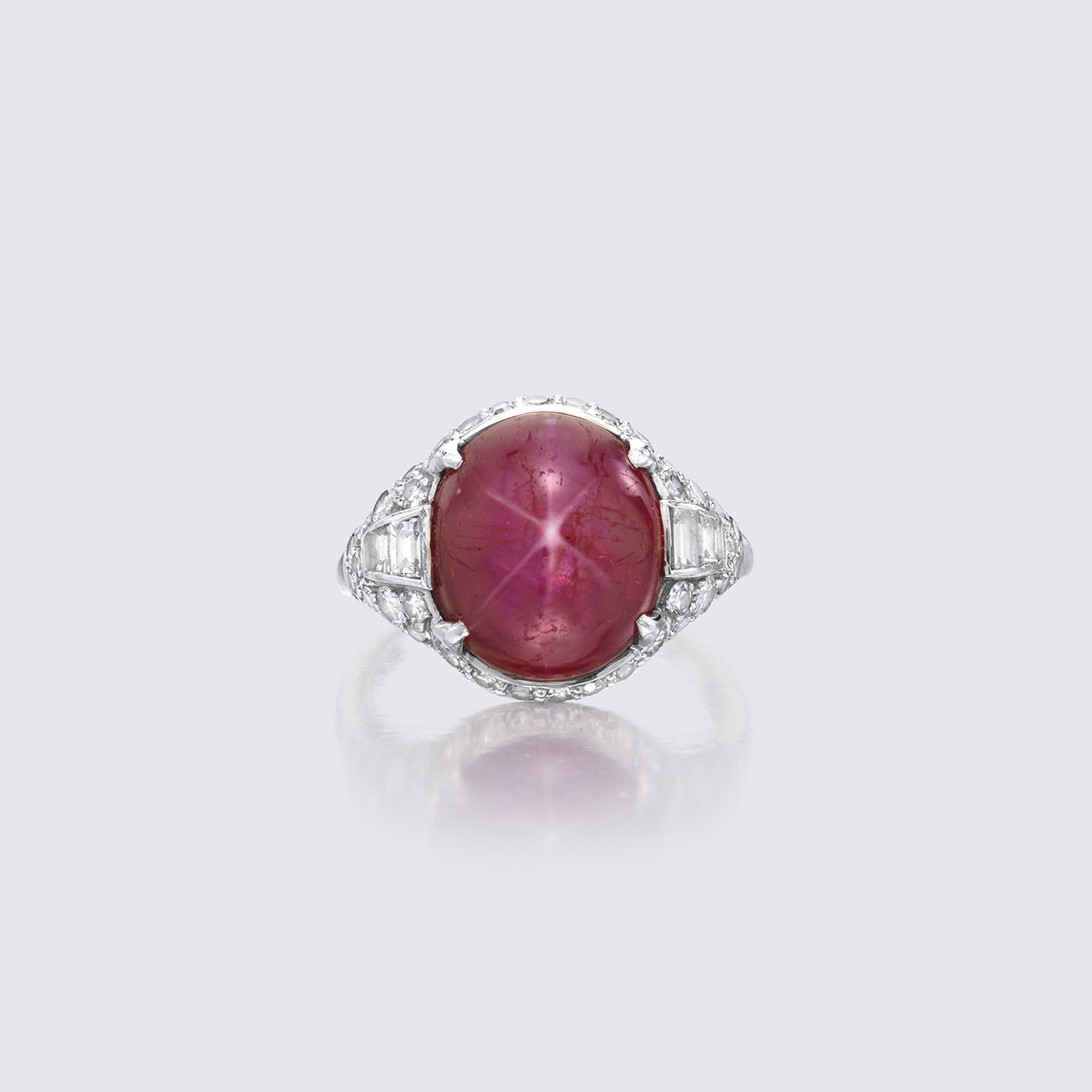 Set with an oval-shaped star ruby cabochon, decorated with circular-cut and baguette diamonds, mounted in platinum, size 5.