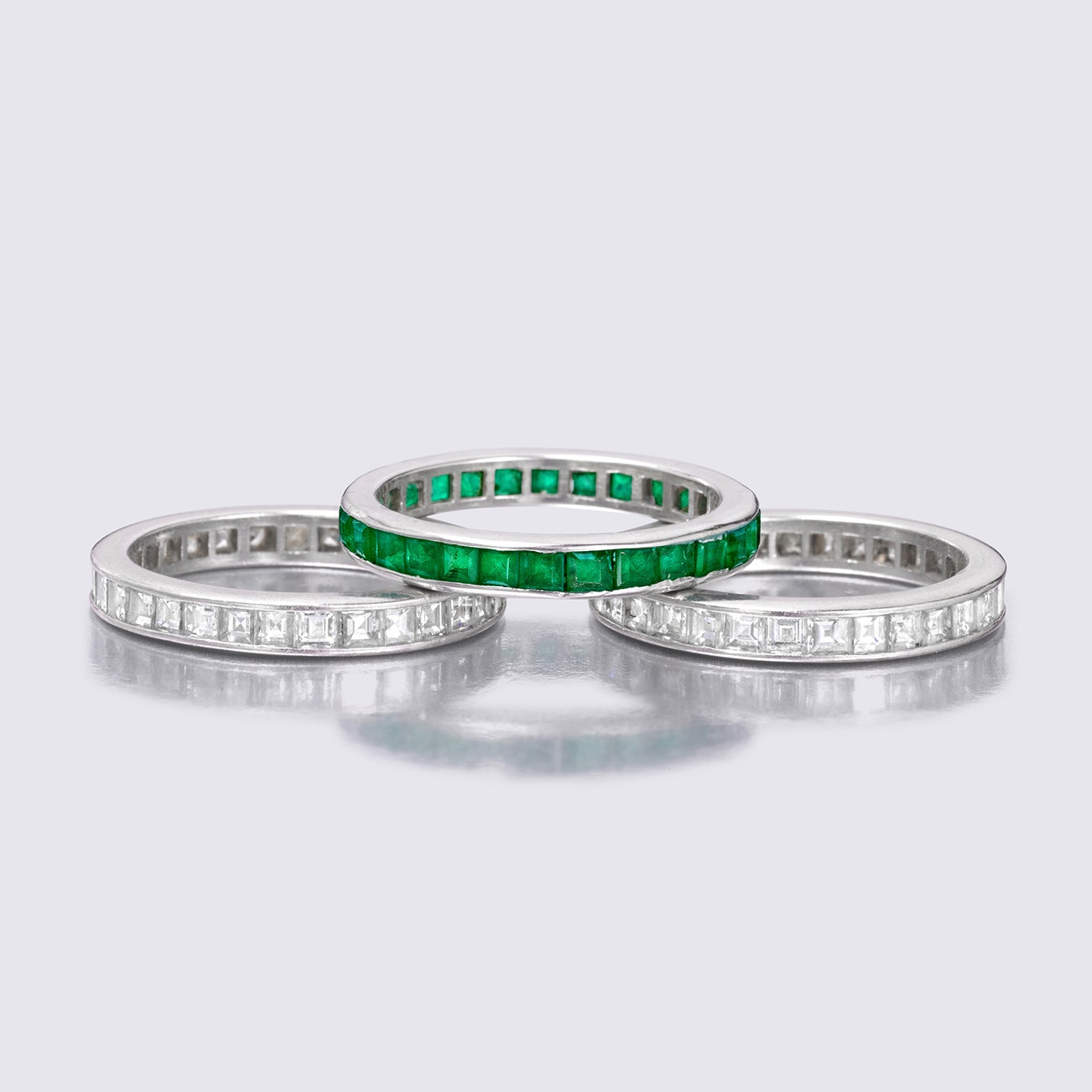 Comprising three channel-set eternity bands, one band set with square-shaped emeralds, mounted in platinum, size 6 1/4; two bands set with Asscher-cut diamonds, mounted in platinum, size 5 and 5 3/4.