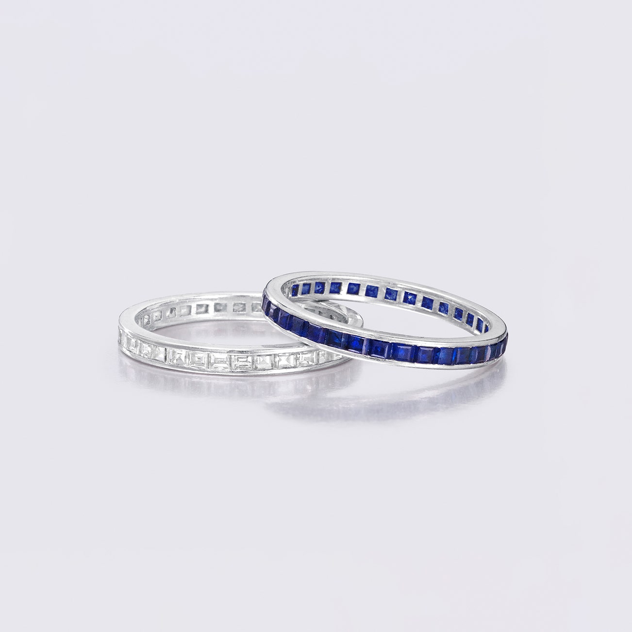 Comprising two channel-set eternity bands, one set with rectangular-shaped sapphires, one set with rectangular-shaped diamonds, mounted in platinum, both size 5 1/2.