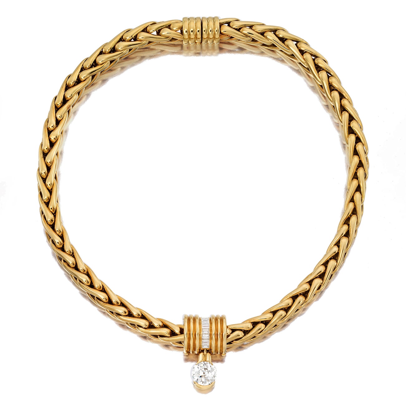 Set with an old European brilliant-cut diamond weighing approximately 4.56 carats, accented by eight baguette diamonds, mounted in 18K yellow gold, length approximately 17 inches, with maker's marks and two interchangeable silk cords.