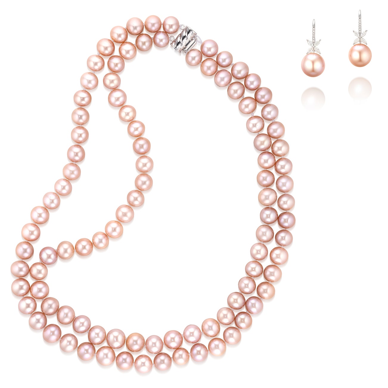 The double-strand necklace composed of ninety-seven pink cultured pearls measuring approximately 7.83 to 9.58 mm, completed by a white gold clasp, length approximately 427 mm; and a pair of matching ear pendants, each set with a pink cultured pearl measuring approximately 11.15 and 11.29 mm respectively, highlighted by marquise-shaped diamonds, to the diamond-set hook, mounted in white gold, ear hook fittings, length approximately 36 mm.