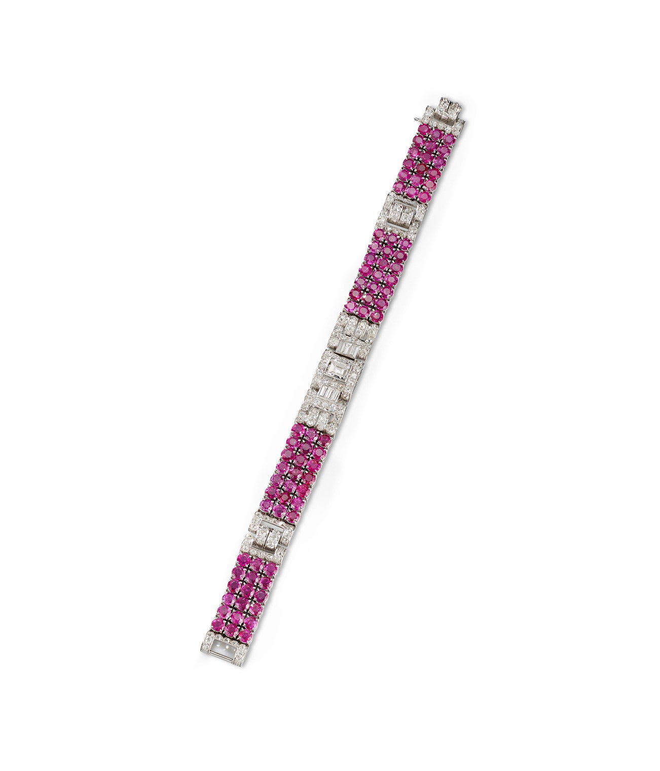 Set with circular-cut rubies, accented with a central step-cut diamond and circular-cut and baguette diamonds, length approximately 175mm.