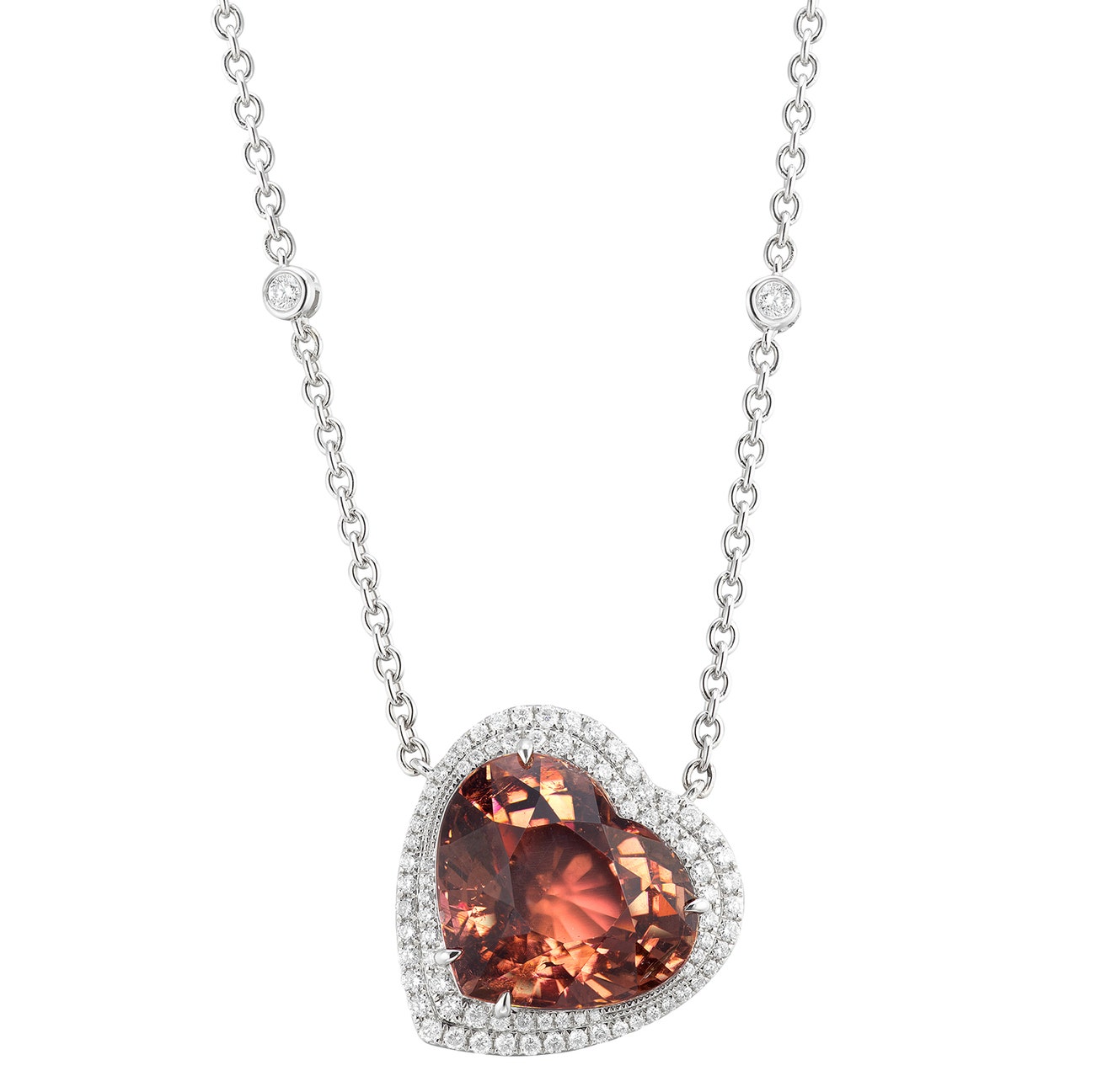 Set with a heart-shaped pink tourmaline weighing approximately 19.97 carats, surrounded by brilliant-cut diamonds, to a collet-set diamond spectacle-link chain , mounted in white gold, pendant length approximately 22mm, maximum length approximately 465 mm.