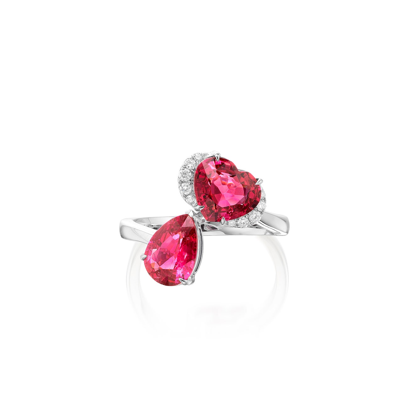 Of toi et moi design, set with heart- and pear-shaped red spinels weighing approximately 1.53 and 1.35 carats respectively, highlighted with brilliant-cut diamonds, mounted in white gold, size 6¼.