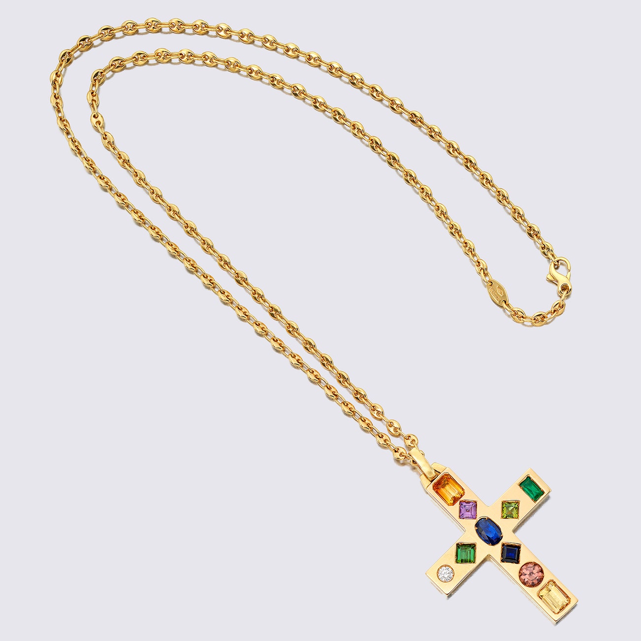 Of a cross design, set with multi-colored gemstones, accented with a brilliant-cut diamond, mounted in 18K yellow gold, chain length measuring approximately 23 inches, pendant length measuring approximately 2 1/4 inches, signed Roman on the chain, with maker's mark.
