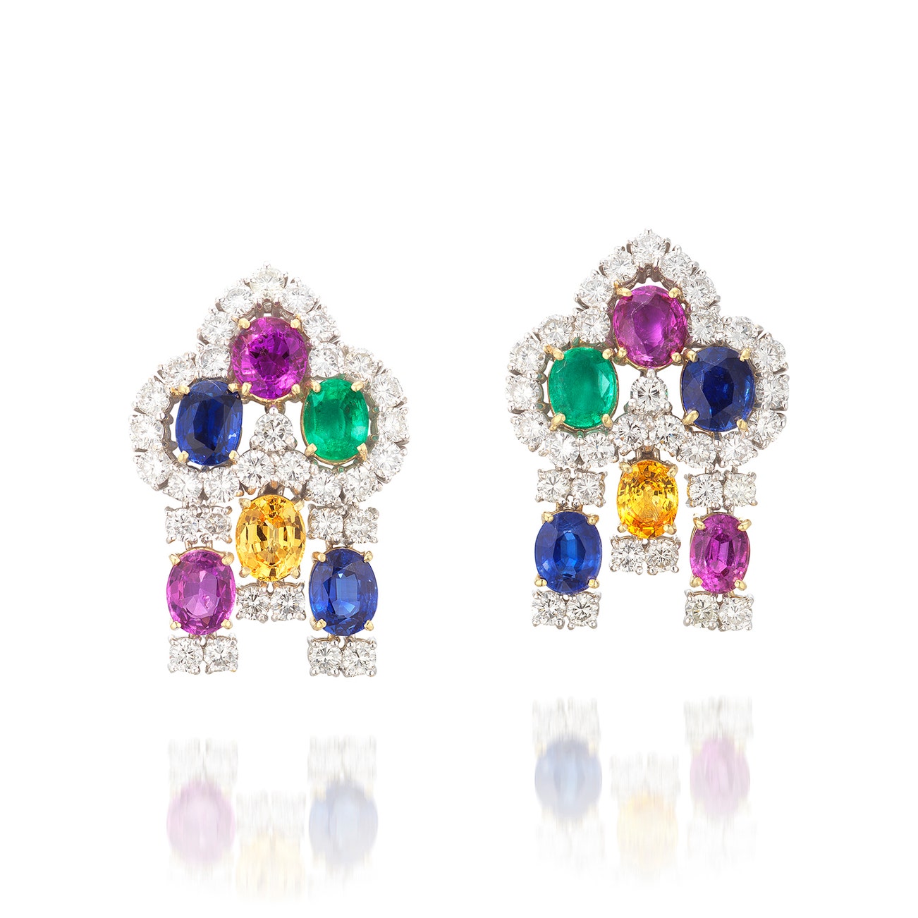 Each suspending three fringes, set with oval sapphires, pink sapphires, yellow sapphires and emeralds, embellished with brilliant-cut diamonds, mounted in white and yellow gold, post and hinged back fittings, length approximately 32 mm