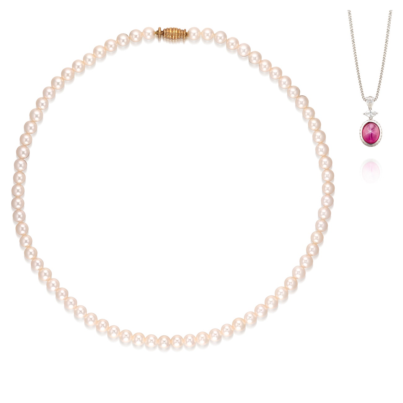 One necklace composed of seventy-two white cultured pearls measuring approximately 5.95 to 5.53 mm, completed by a gold clasp, length approximately 420 mm; and the pendant necklace, set with a cabochon star ruby, surrounded by brilliant-cut diamonds, suspended from the marquise- and pear-shaped diamond surmount, to the link chain, link chain with Italian assay and maker's marks, pendant length approximately 23mm, link chain length approximately 395 mm.