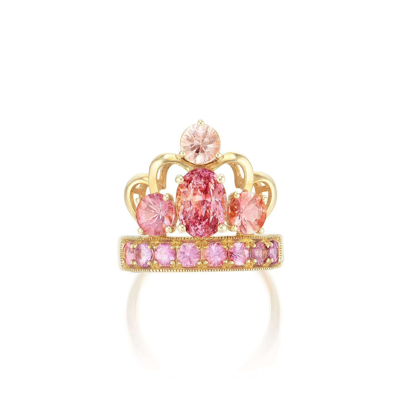 Set with an oval orangy pink sapphire weighing approximately 2.58 carats, highlighted with circular-cut pink sapphires, mounted in yellow gold, size 5¾.