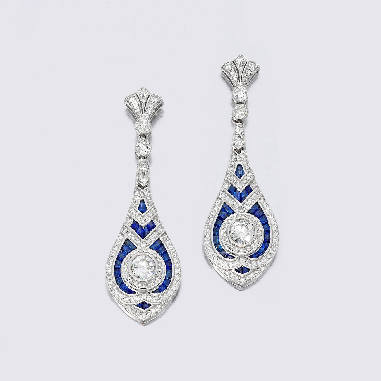 Each set with an old-cut diamond, accented by tapered rectangular-shaped sapphires and circular-cut diamonds, mounted in 18K white gold, length approximately 1 7/8 inches, fitted with posts.