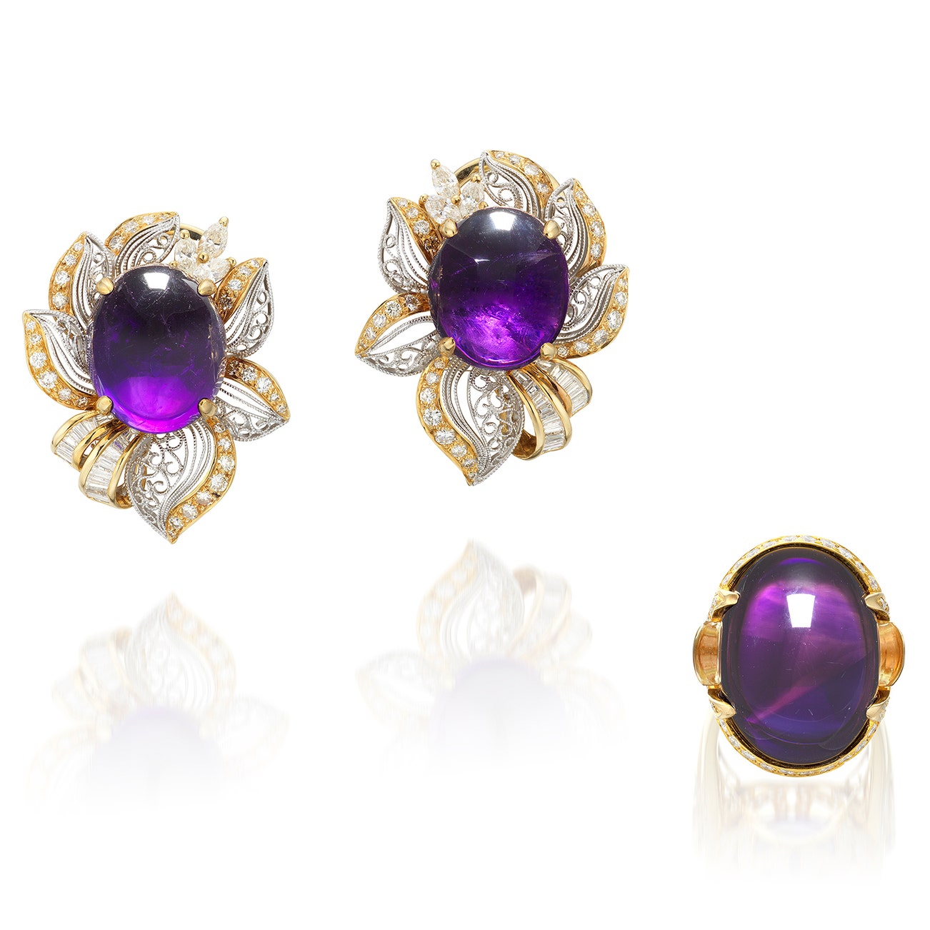 The pair of earrings of floral design, centring on an oval cabochon amethyst, to the filigree petals decorated with marquise-shaped, tapered baguette and brilliant-cut diamonds, mounted in yellow and white gold, post and hinged back fittings, length approximately 34 mm; and a ring, set with an oval cabochon amethyst, flanked by two tapered cabochon rock crystals, to the brilliant-cut diamondsurround, gallert and shoulders, mounted in yellow gold, size 4¾.