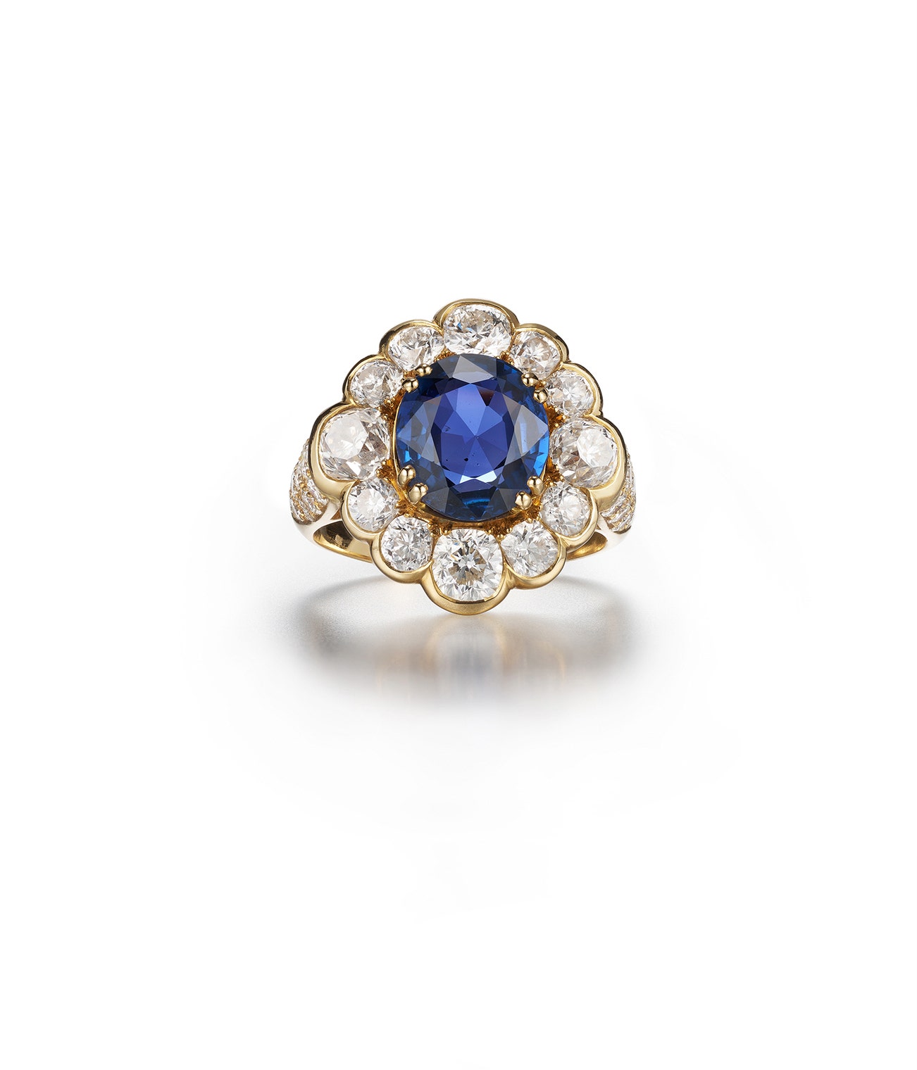 Set with an oval sapphire weighing 4.93 carats, within a circular-cut diamond surround, the shoulders embellished with brilliant-cut diamonds, size 60, French import mark for gold.