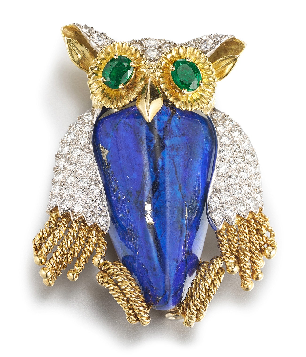 Modelled as an owl, the body set with a cabochon lapis lazuli, the eyes set with oval emeralds, the wings and head embellished with brilliant-cut diamonds, measuring approximately 45 x 30mm, signed VC & A.