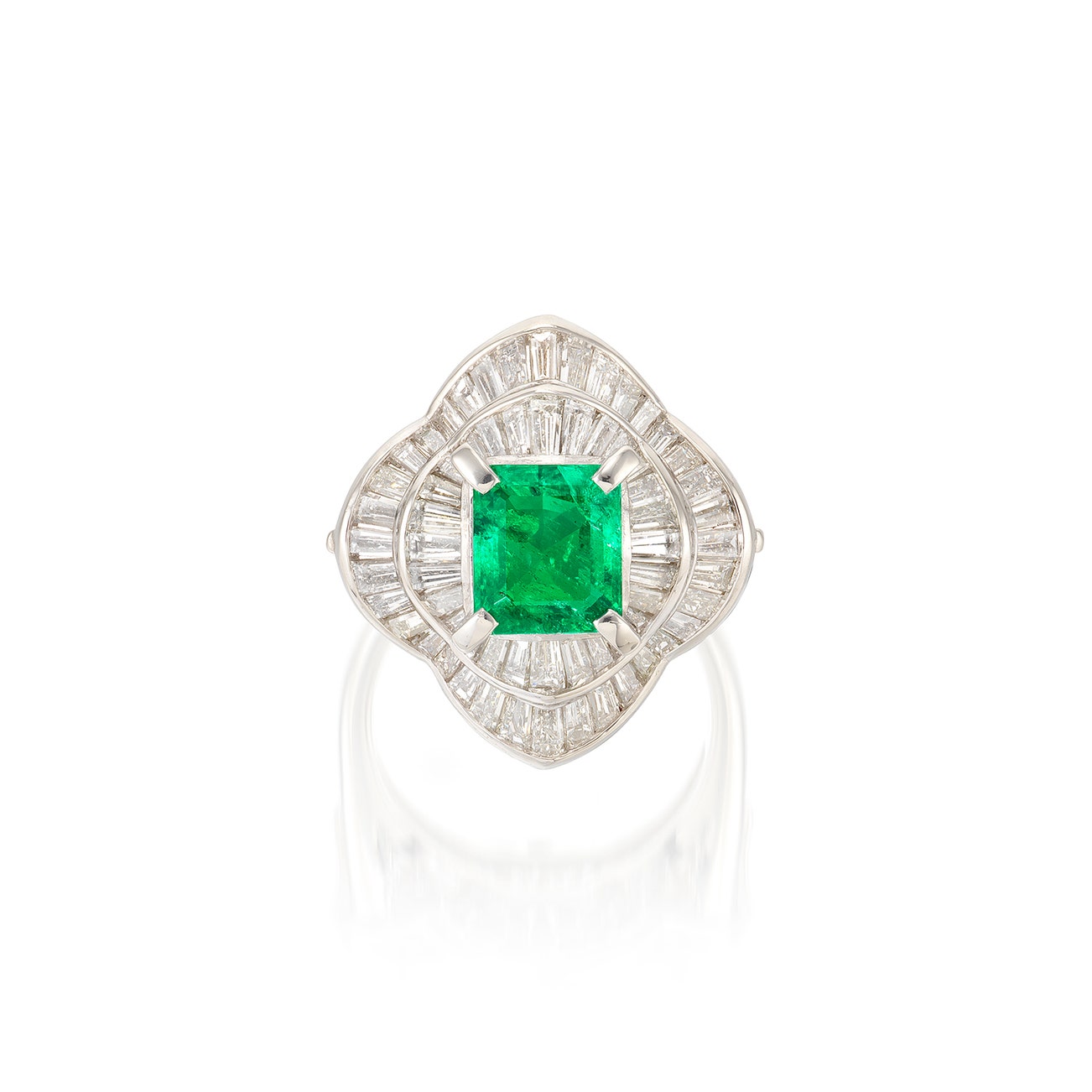 Set with a step-cut emerald, within a twin-row ballerina surround embellished with tapered baguette diamonds, mounted in platinum, size 6.