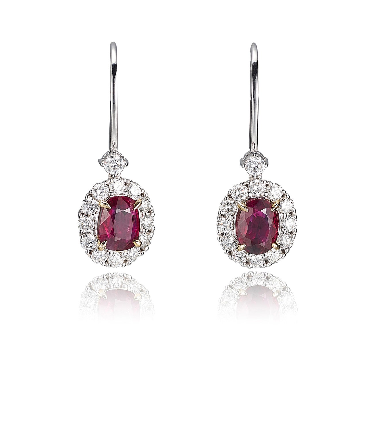 Each set with an oval ruby weighing 1.01 carats and 0.98 carats, accented with brilliant-cut diamonds, length approximately 26mm.