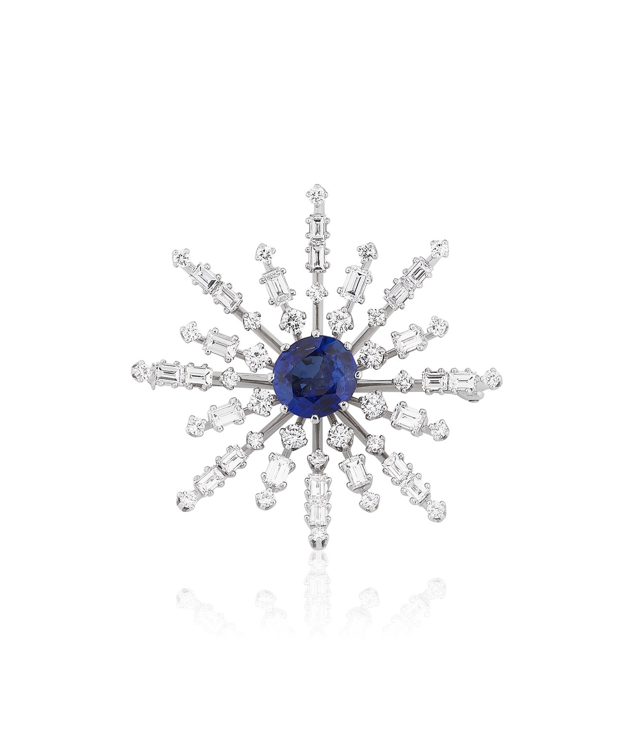 Set with an oval sapphire weighing 3.67 carats, accented with baguette and brilliant-cut diamonds, measuring approximately 40 x 45mm.