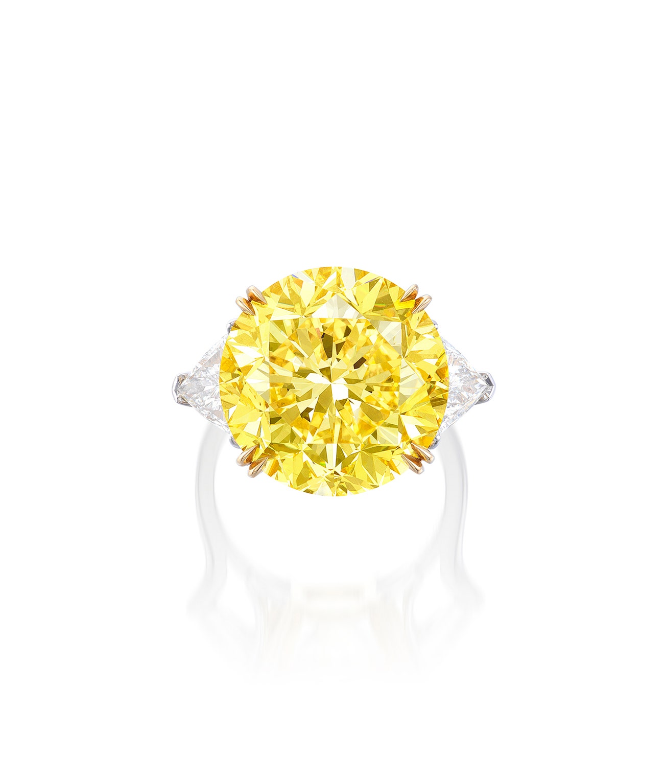 Set with a brilliant-cut fancy vivid yellow diamond weighing 15.51 carats, between two triangular-shaped diamonds, mounted in platinum and yellow gold, size 6¼.