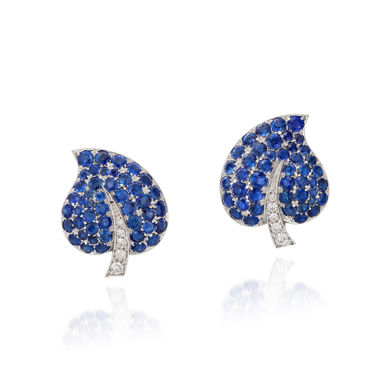 Each designed as a leaf pavé-set with circular-cut sapphires, to the brilliant- and single-cut diamond petiole, mounted in platinum, post and butterfly fittings, length approximately 25 mm.
