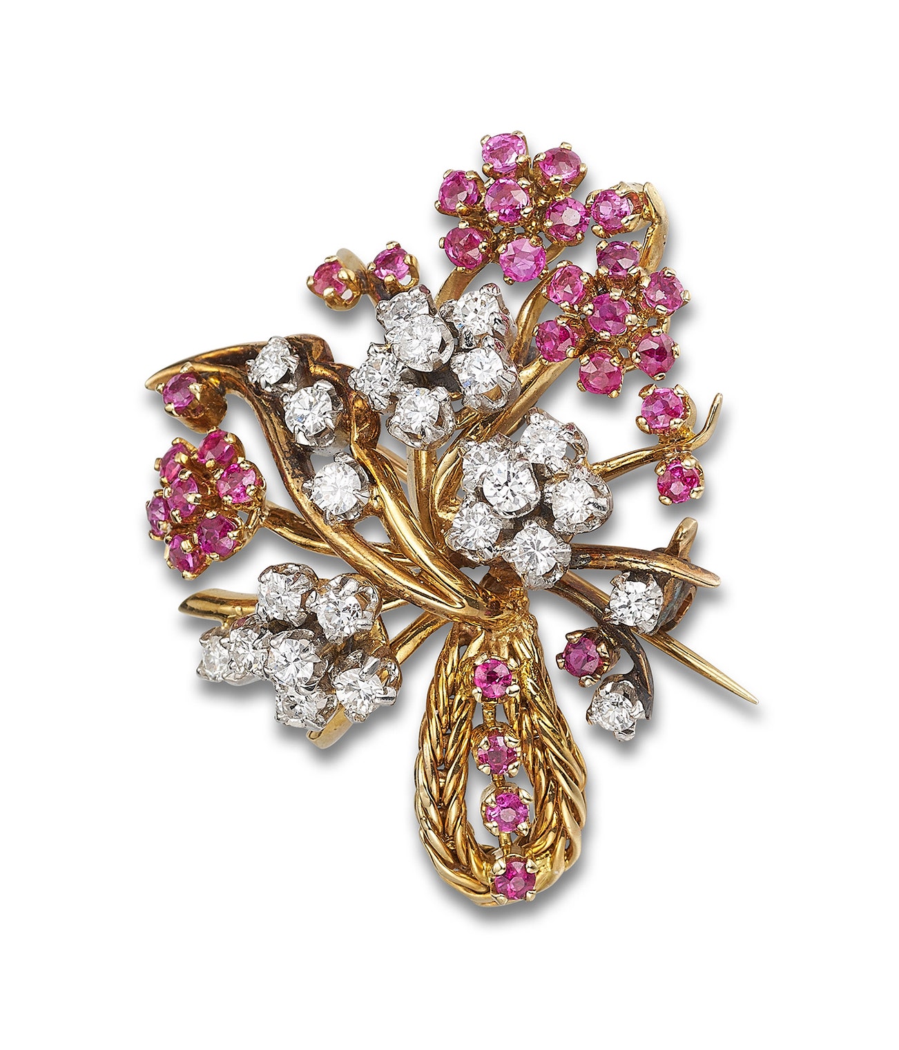 Modelled as a bouquet, the flowers set with circular-cut rubies and brilliant-cut diamonds, measuring approximately 35 x 30mm.
